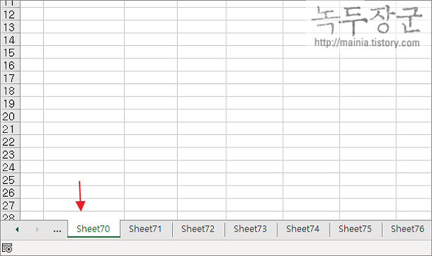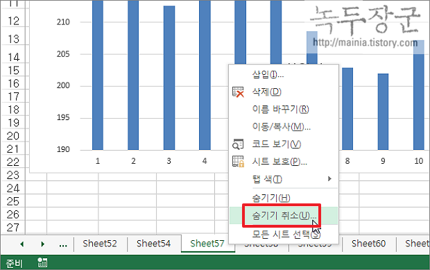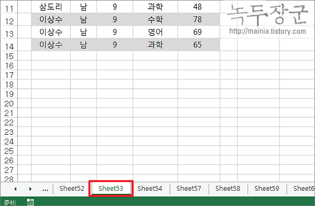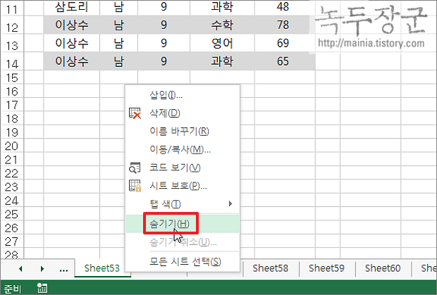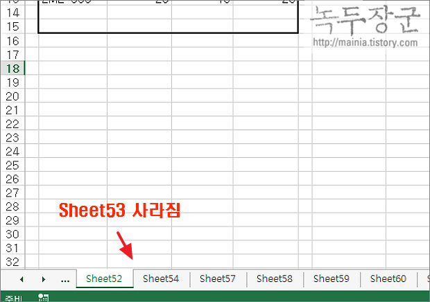 ▼ 그림처럼 숨기기한 Sheet53 이 화면에서 사라졌습니다.