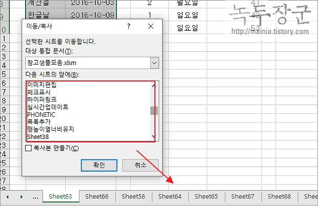 ▼ 이동/복사 대화상자에는 모든 시트 목록이 뜹니다. 바로 이동하기를 원하는 시트를 선택하고 확인 버튼을 누릅니다.