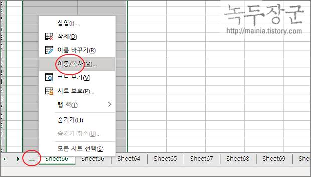 ▼ 시트가 많은 경우 탭으로 한 번에 다 보여줄 수 없습니다. 그래서 왼쪽과 오른쪽 끝에 더보기 버튼을 통해서 차례대로 이동합니다. 한 번에 여러 탭을 건너뛰기 위해서는 이동 기능을 이용해야 합니다. 더보기 > 이동/복사 메뉴를 선택합니다.