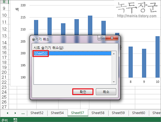 ▼ 결과는 다음과 같습니다. 이전에 숨겼던 Sheet53 이 다시 나타났습니다. 아쉽게도 [숨기기 취소] 에는 시트를 다중 선택할 수 없습니다. 숨기기 취소할 것들이 많다면 일일이 하나씩 선택해서 취소해야 합니다.