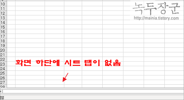 ▼ 위에서 설명한 내용은 시트 하나를 숨기거나 보이게 하는 기능이었습니다. 이번에는 시트 탭 전체를 숨겨보겠습니다. 이것은 엑셀 옵션에서 설정을 변경해야 합니다. 만약 엑셀 화면에 시트 탭이 보이지 않는다면 숨긴 것입니다.