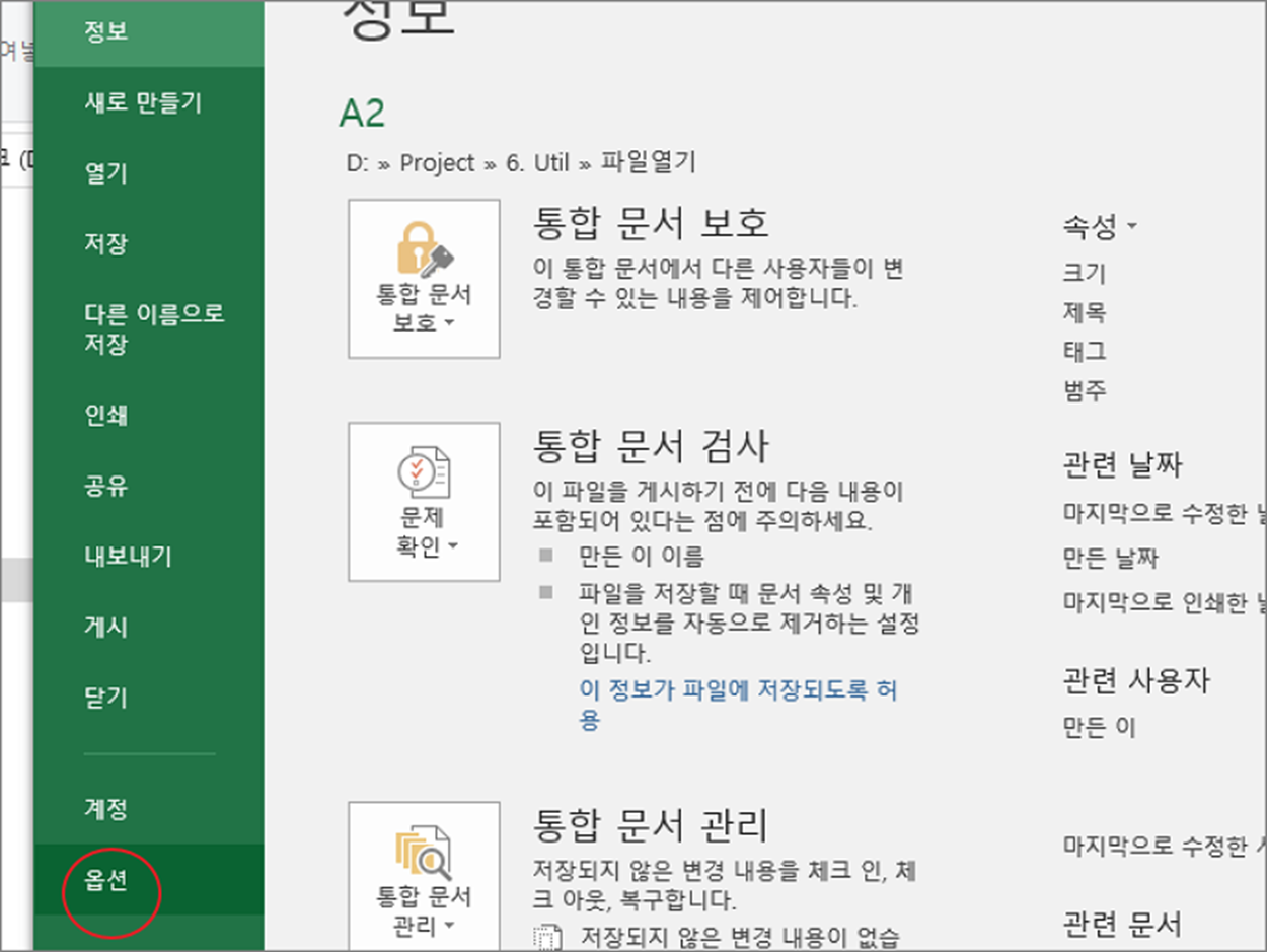 ▼ 복사한 폴더 주소는 엑셀 설정으로 가서 붙여 넣겠습니다. 엑셀 > 파일 > 옵션 메뉴를 클릭합니다.