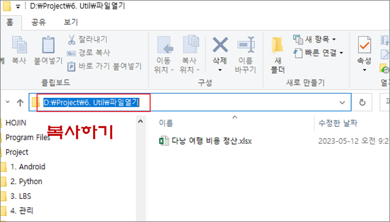 ▼ 엑셀 프로그램 시작과 함께 띄우고 싶은 문서가 있다면 폴더를 만들고 파일을 추가합니다. 파일을 직접 연결하는 것은 아니고 폴더를 링크합니다. 폴더 내에 모든 프로그램을 오픈하는 구조입니다. 자신이 엑셀 프로그램을 실행하고 바로 열고 싶은 파일이 들어가 있는 폴더를 탐색기에서 찾아 주소를 복사합니다.