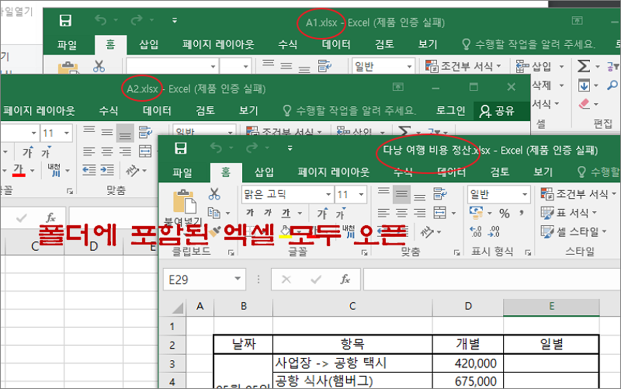 ▼ 결과는 다음과 같습니다. 엑셀 프로그램 실행과 함께 지정한 폴더에 있는 모든 파일이 같이 실행됩니다.