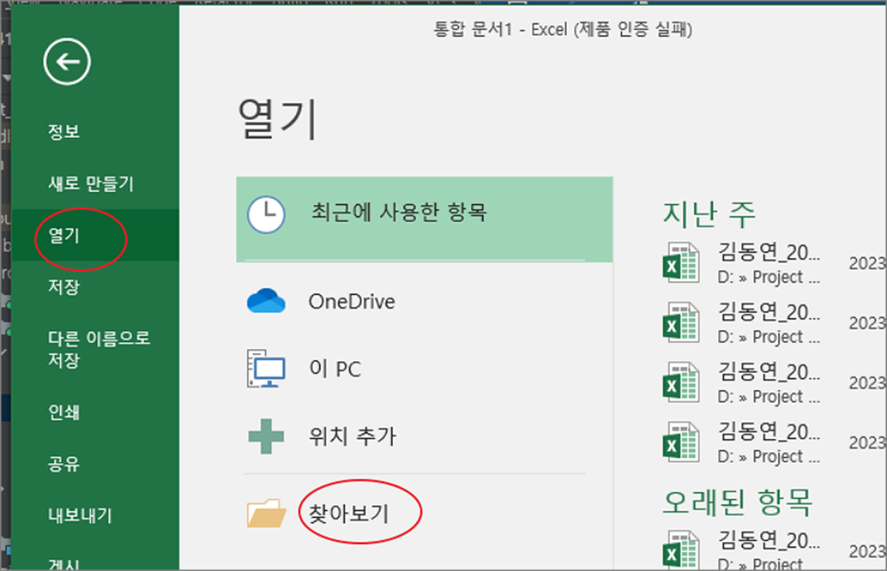 ▼ 먼저 원본 엑셀 파일을 엽니다. 엑셀을 실행하고 파일 탭 > 열기 > 찾아보기 로 파일을 지정합니다.