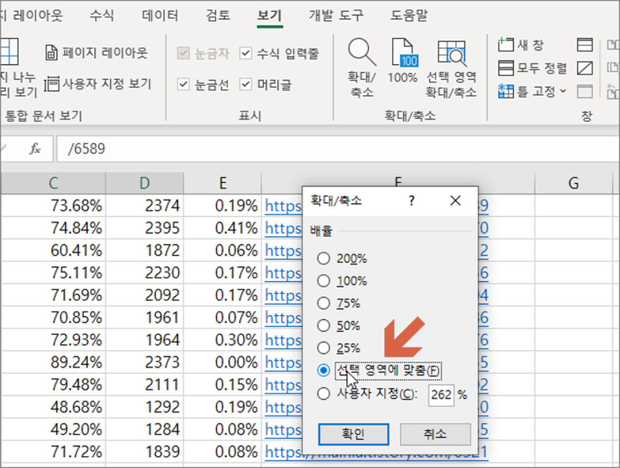 ▼ 확대/축소 대화상자 목록에서 선택 영역에 맞춤 옵션을 찾아 체크하고 확인 버튼을 누릅니다.
