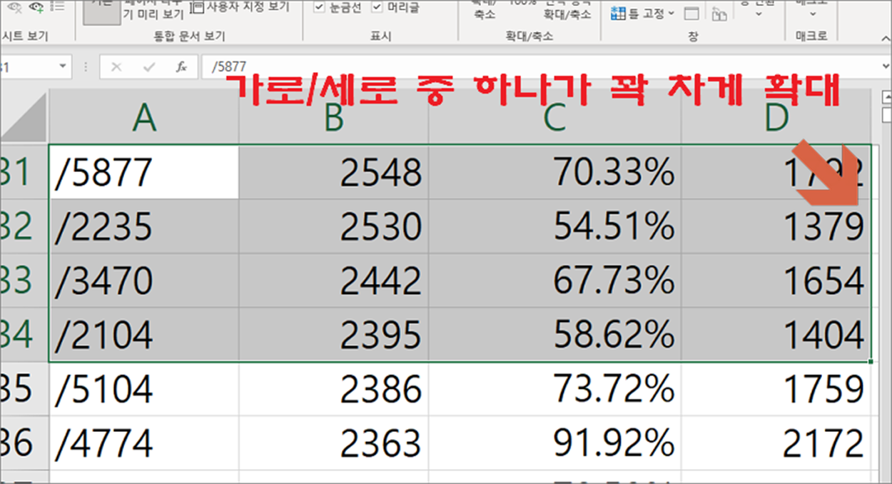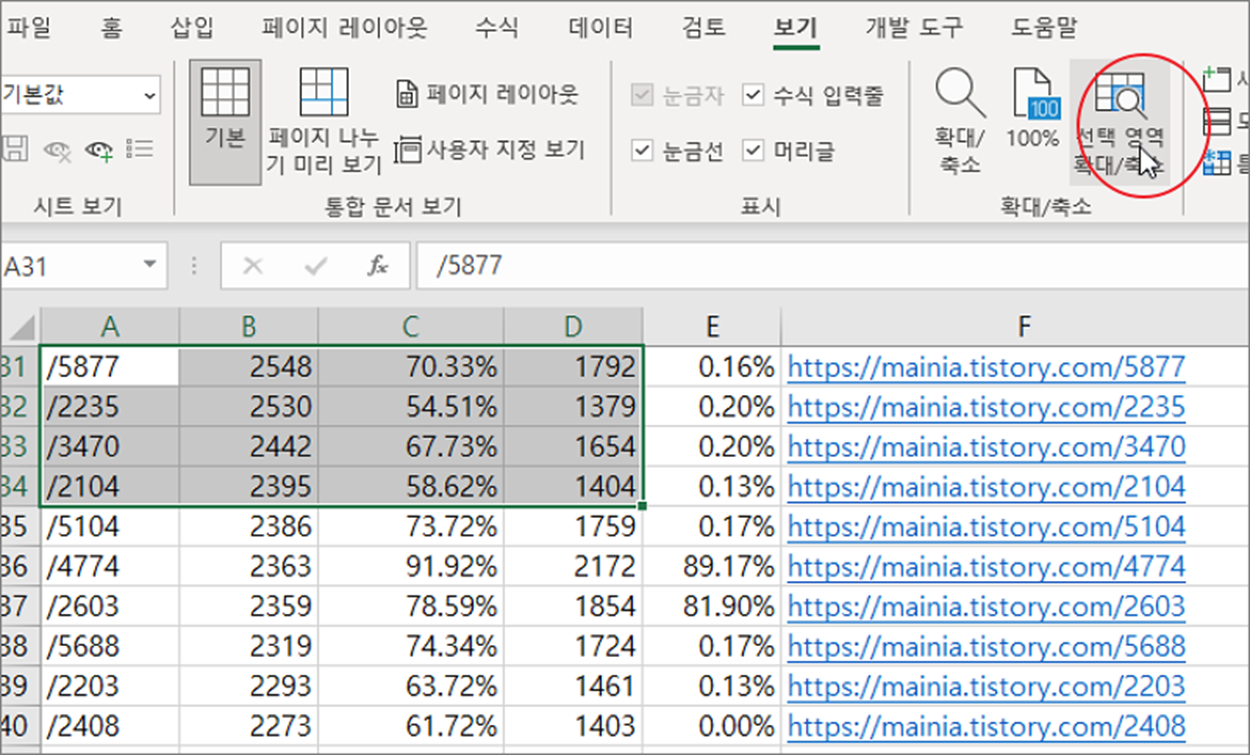 ▼ 먼저 확대/축소 메뉴에서 선택 영역을 확대하는 방법입니다. 확대할 영역을 선택합니다. 그리고 보기 탭 > 확대/축소 그룹 > 확대/축소 리본 메뉴를 클릭합니다.