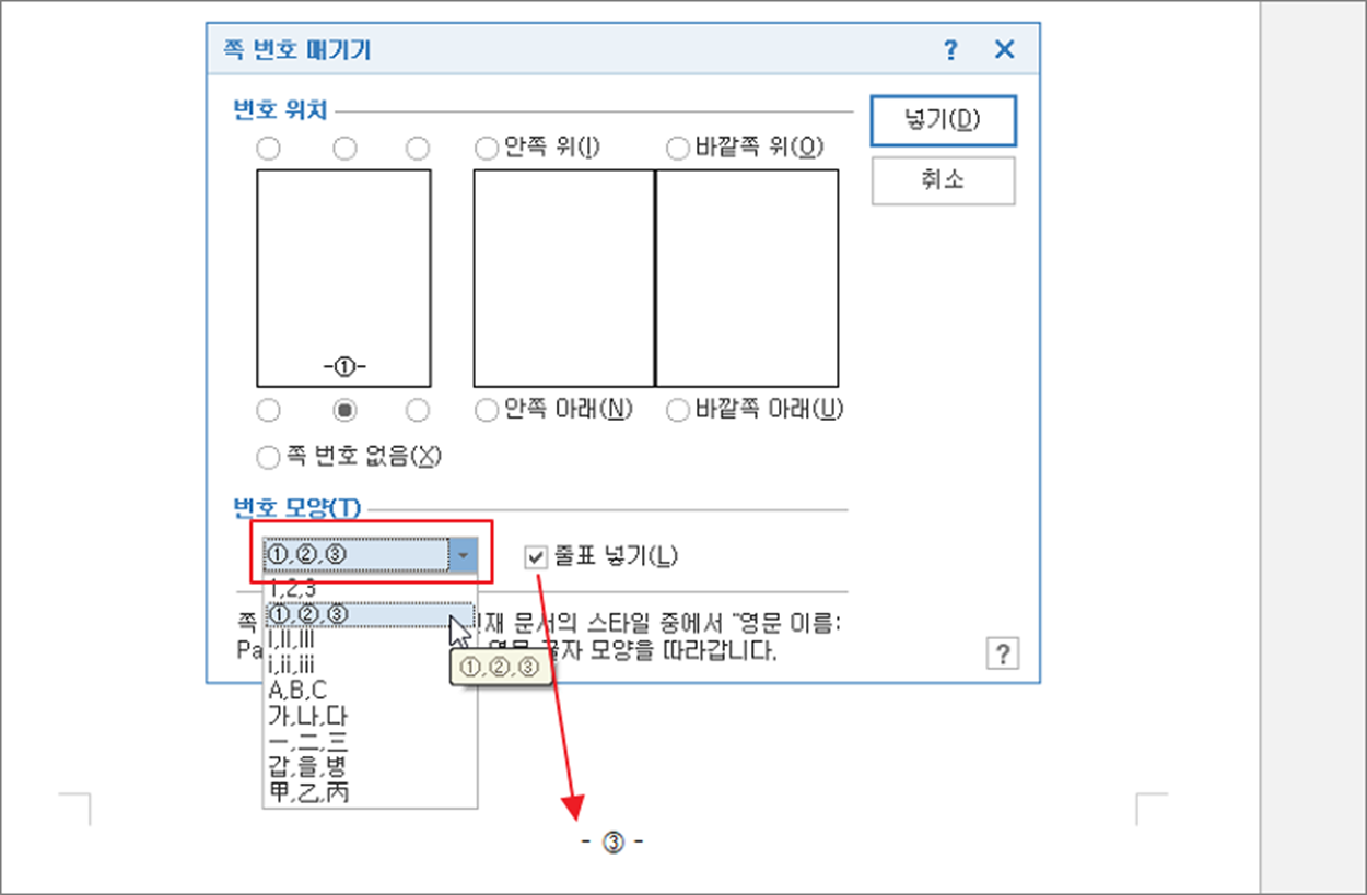 ▼ 쪽 번호 매기기의 두 번째 옵션은 번호 모양 입니다. 아라비아 숫자뿐만 아니라 다양한 언어로 숫자를 표시할 수 있습니다. 그리고 숫자 양 옆에 줄표를 넣거나 빼는 옵션도 있습니다.