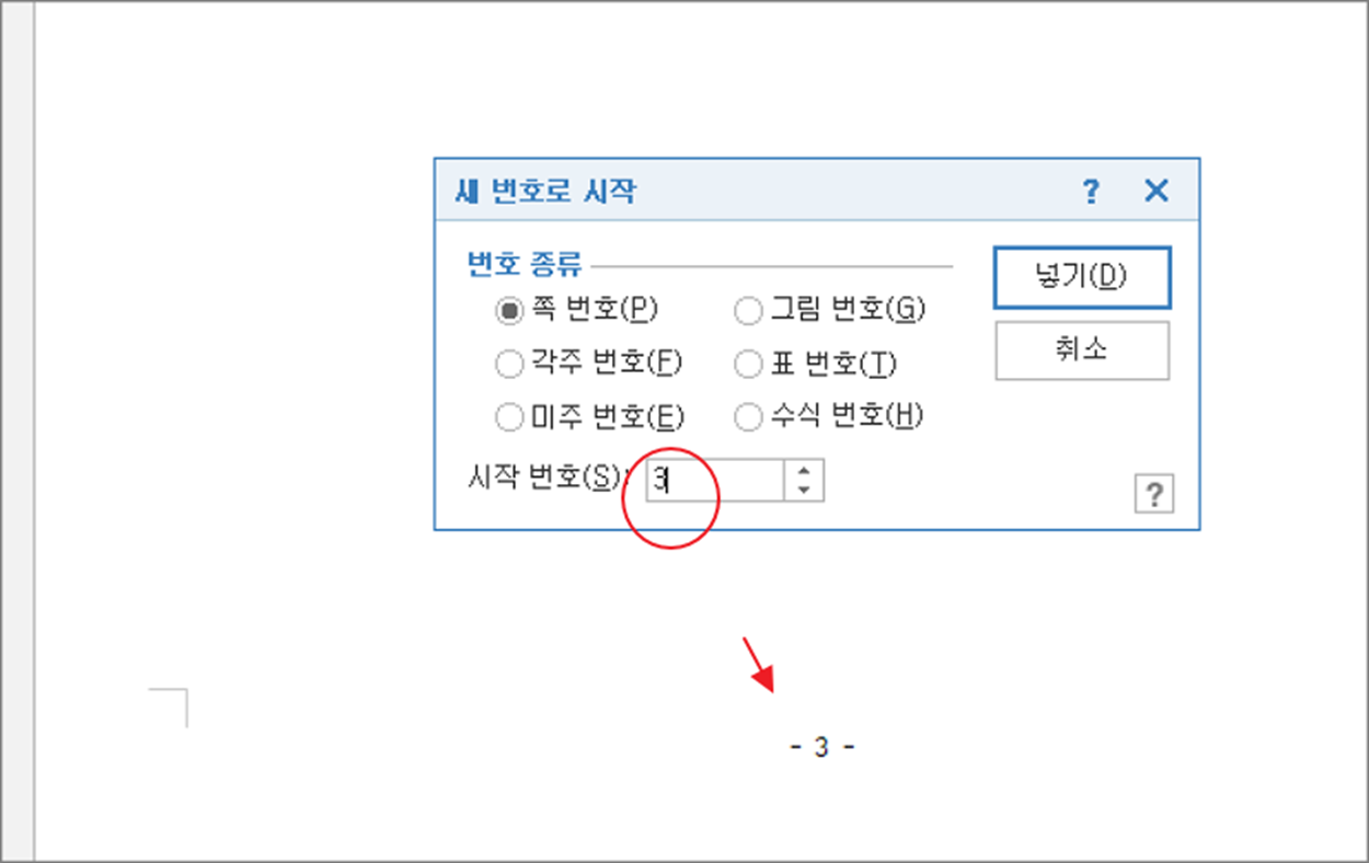 ▼ 대화상자에서 자신이 원하는 번호를 시작 번호란에 입력합니다. 넣기 버튼을 눌러 적용하면 첫 페이지에 지정한 페이지 번호는 3이 됩니다.