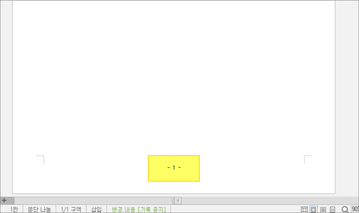 ▼ 아래 그림과 같이 페이지에 쪽 번호가 들어갑니다. 쪽번호의 위치나 모양을 변경하고 싶다면 다시 쪽 번호 매기기 대화상자를 띄웁니다.