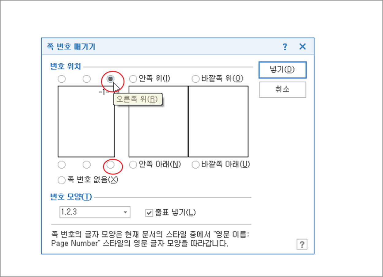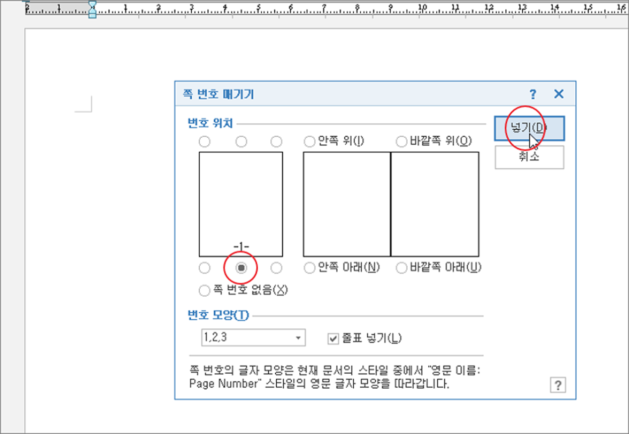 ▼ 쪽 번호 매기기 대화상자에는 페이지 번호와 관련된 옵션들이 있습니다. 번호 위치는 페이지 번호가 들어갈 위치를 지정하는 옵션입니다. 페이지 여백 상단과 하단에서 안쪽, 중앙, 바깥쪽에 번호를 둘 수 있습니다. 기본은 페이지 하단 중앙입니다. 번호 위치를 지정하고 넣기 버튼을 클릭합니다.