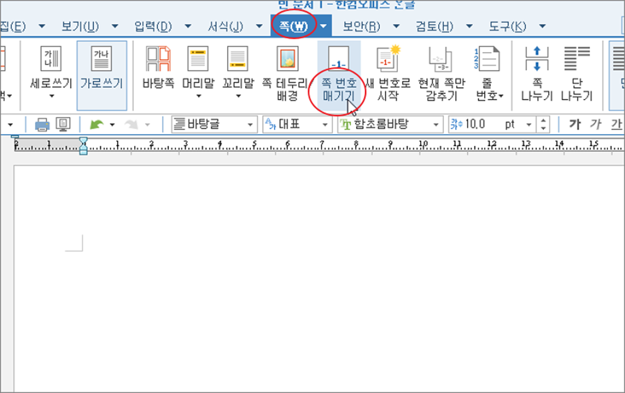 ▼ 페이지에 번호를 넣기 위해 쪽 > 쪽 번호 메기기 리본 메뉴를 클릭합니다.