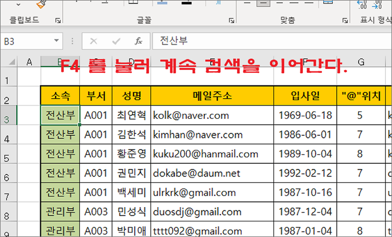▼ 창을 닫은 후 단축키 F4 를 눌러보세요. “찾기 및 바꾸기” 에서 검색했던 동일한 내용으로 검색을 이어 나갈 수 있습니다.