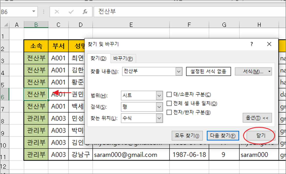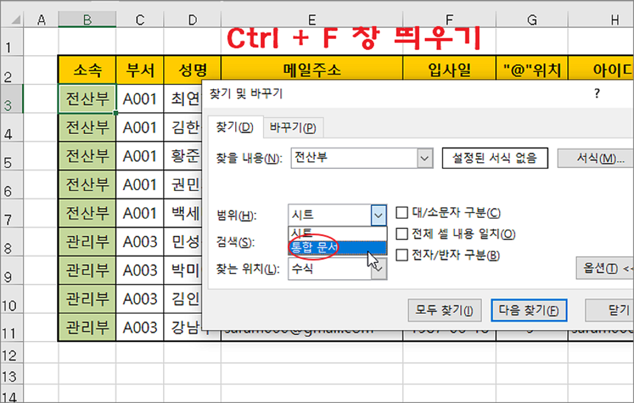 ▼ 이외 개별 시트가 아닌 검색 범위를 전체 문서로 넓혀 보겠습니다. Ctrl + F 를 눌러 창을 띄운 후 범위를 통합 문서로 변경합니다. 그리고 창을 닫고 F4 를 눌러 계속 검색을 진행합니다.