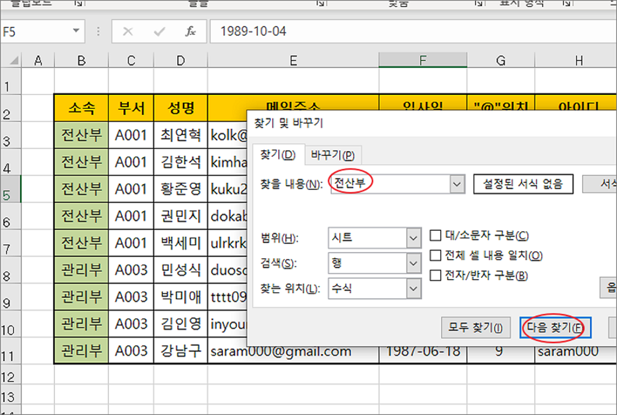 ▼ “찾기 및 바꾸기” 창에서 “찾을 내용” 을 입력하고 “다음 찾기” 버튼을 클릭합니다.