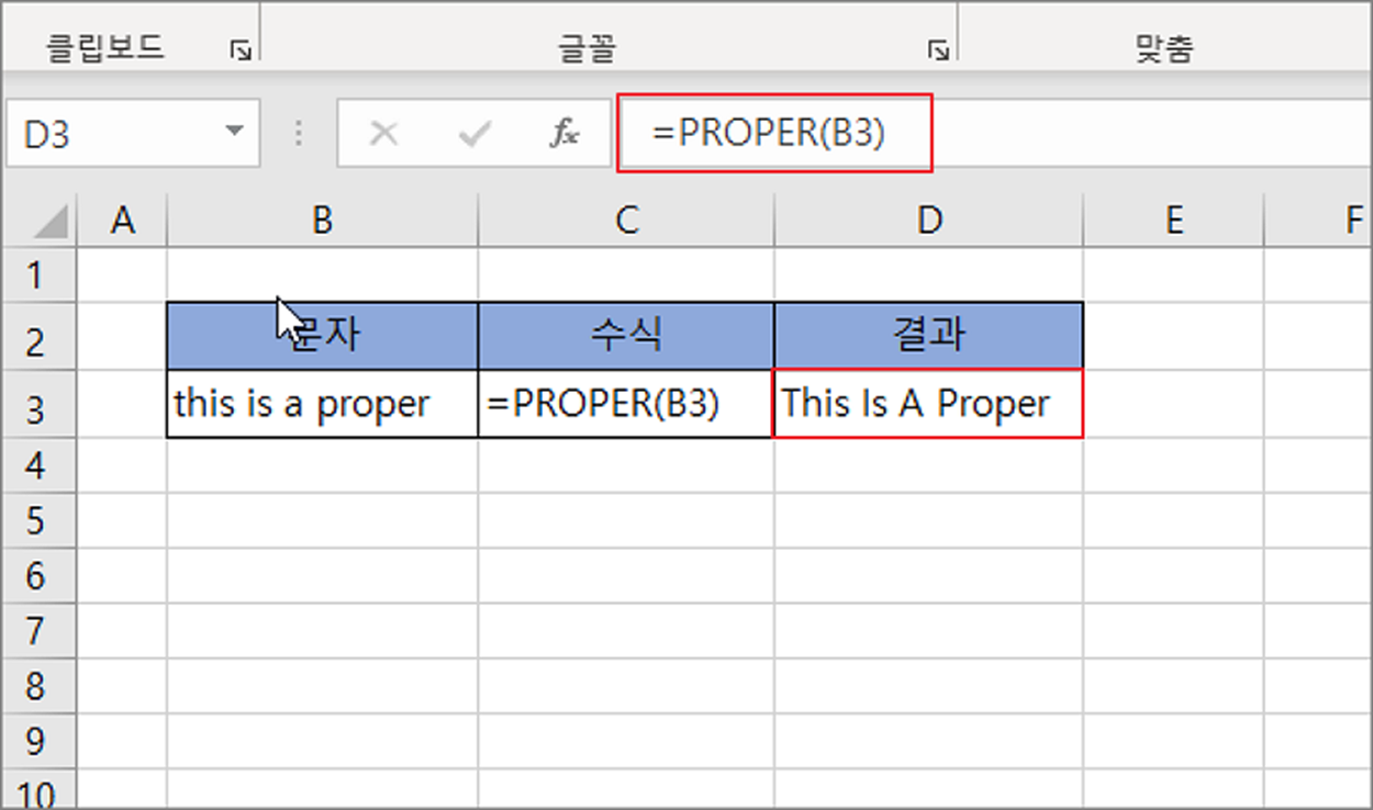 PROPER 함수는 영어 단어의 첫 번째 문자 또는 영문자가 아닌 다음에 오는 문자가 영문자인 경우 대문자로 변환합니다. 그리고 나머지를 소문자로 변경합니다. 영문자를 제외한 숫자, 한글 등은 원본을 그대로 유지합니다. 함수의 형식은 다음과 같습니다.