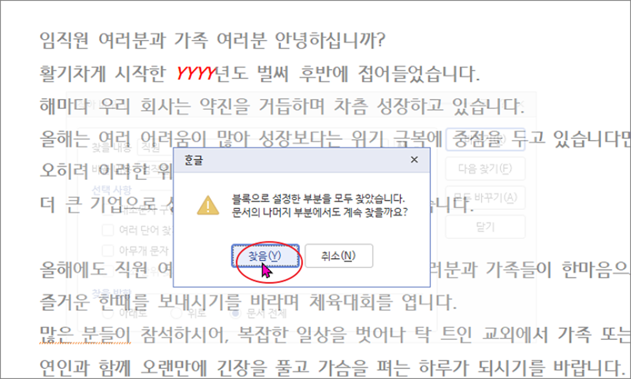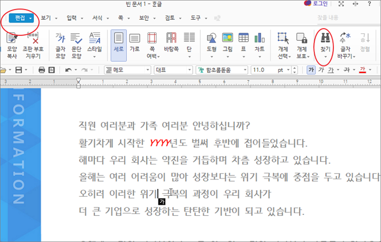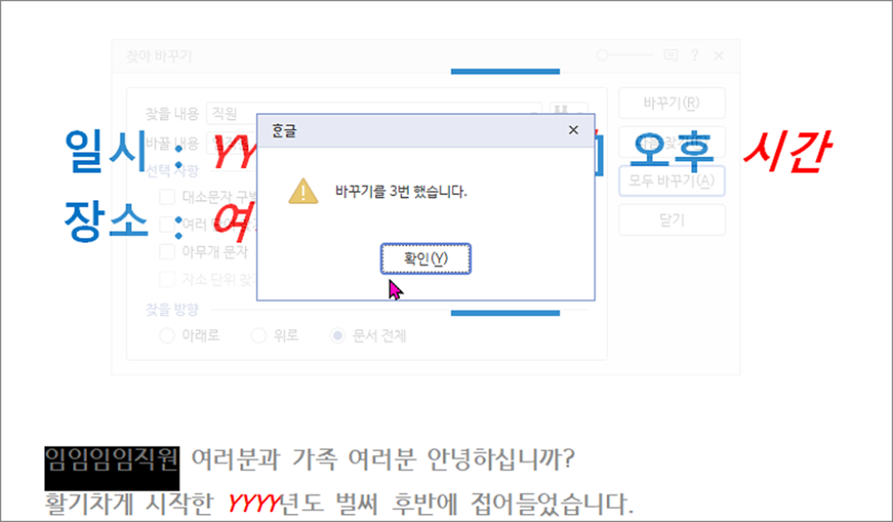 단어의 내용을 일일이 하나씩 찾아 바꾸는 것은 아주 비효율적입니다. 한글에서는 “찾아 바꾸기” 기능을 통해 변경할 데이터 기능을 이용해서 좀더 쉽고 빠르게 내용을 변경하는 방법에 대해 알아보겠습니다.