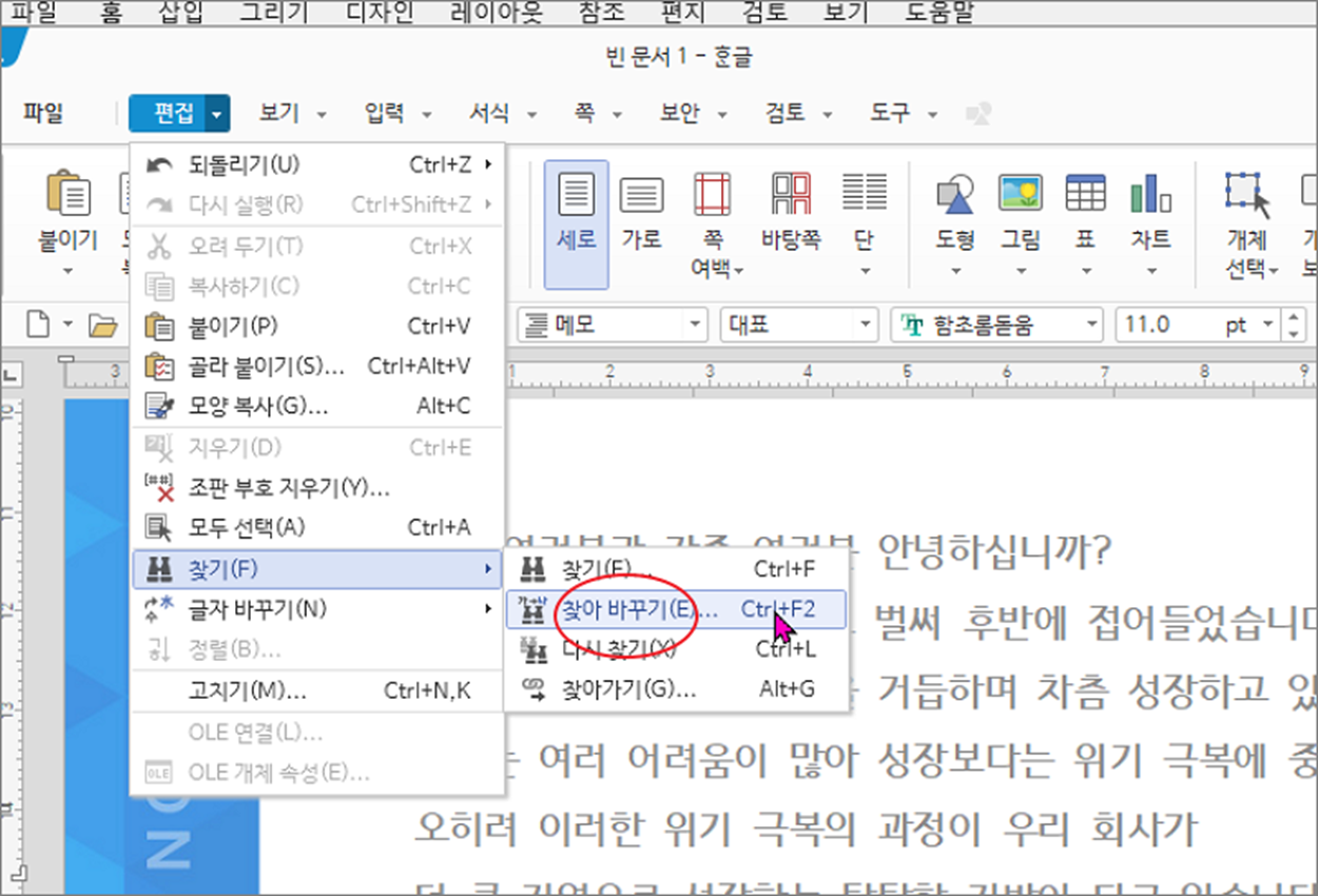 ▼ 찾기 기능을 수행하기 위해서는 [편집]탭 > [찾기] 리본메뉴를 클릭합니다. 그럼 [찾기]와 [찾아 바꾸기] 메뉴를 볼 수 있습니다. 찾아 바꾸기는 단축키가 [Ctrl] + [F2] 입니다.