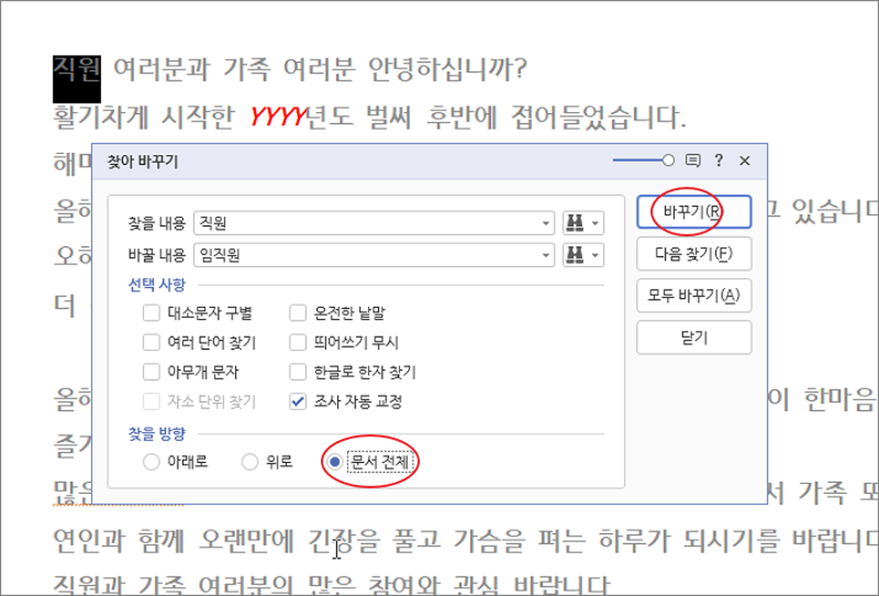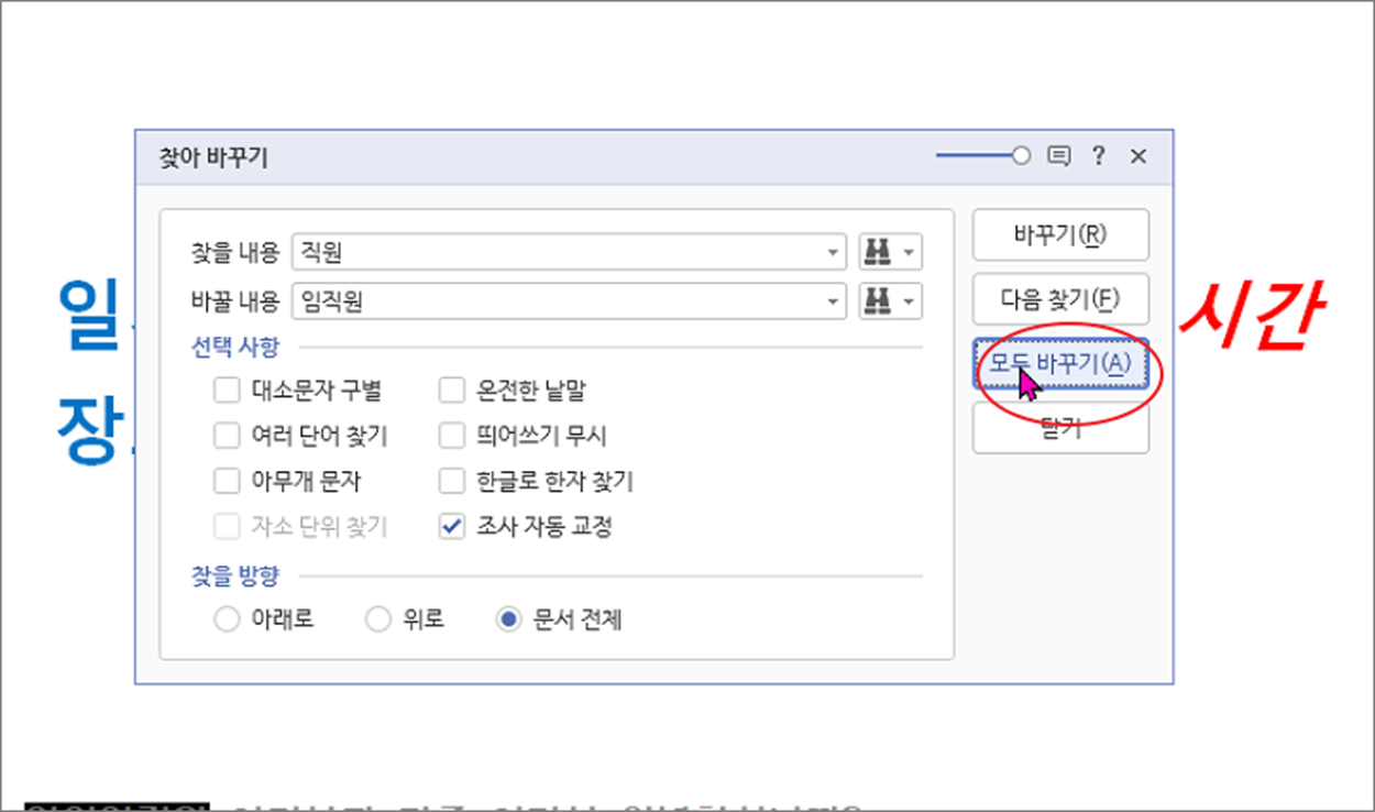 ▼ 하나씩 바꾸기가 귀찮으시다면 아래에 있는 “모두 바꾸기” 버튼을 클릭해서 한번에 바꿀 수가 있습니다. 그리고 “모두 바꾸기” 를 클릭하기 전에 찾을 방향을 “문서 전체” 로 하는 것이 좋습니다. 한쪽 방향으로 하면 커서가 있는 반대 방향의 데이터는 바뀌지 않기 때문입니다.