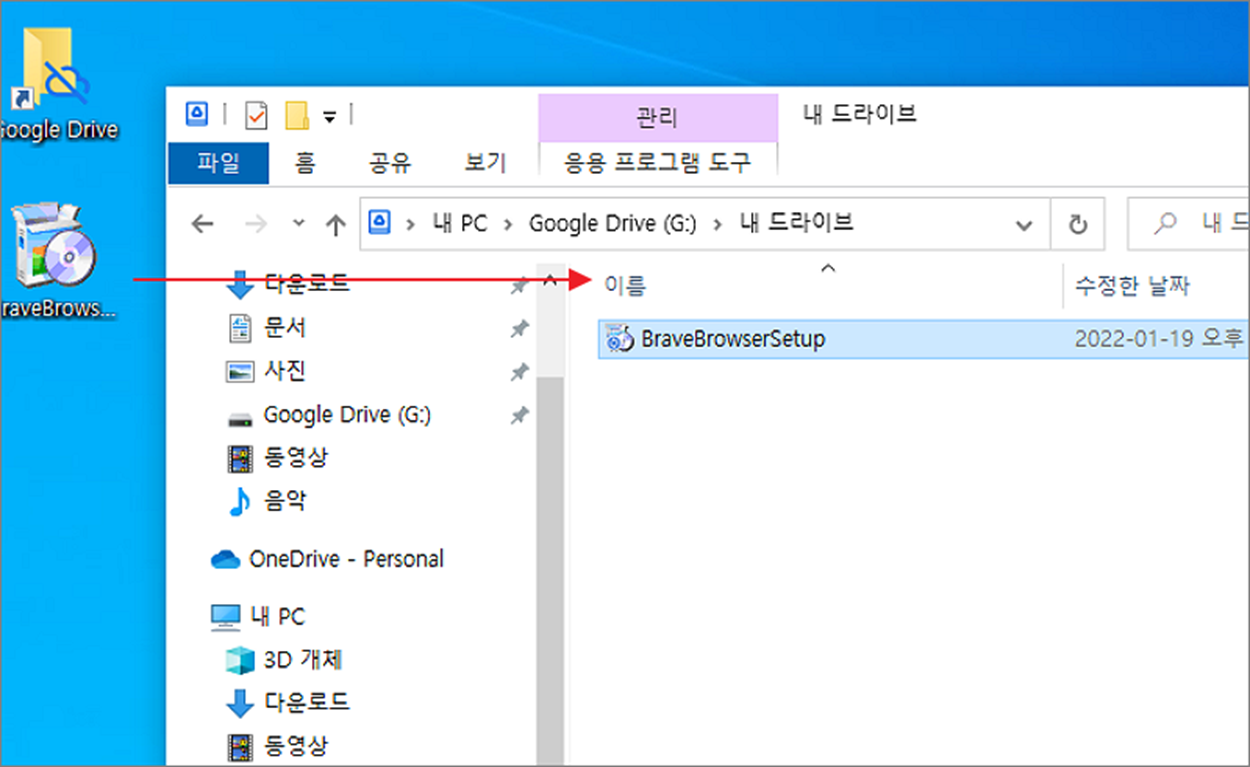 ▼ 폴더에 파일을 끌어서 놓거나 붙여 넣습니다. 탐색기의 “내 드라이브” 폴더에 파일을 추가하면 자동으로 구글 드라이브와 동기화가 진행되기 때문에 웹 사이트에 접속하지 않아도 됩니다.