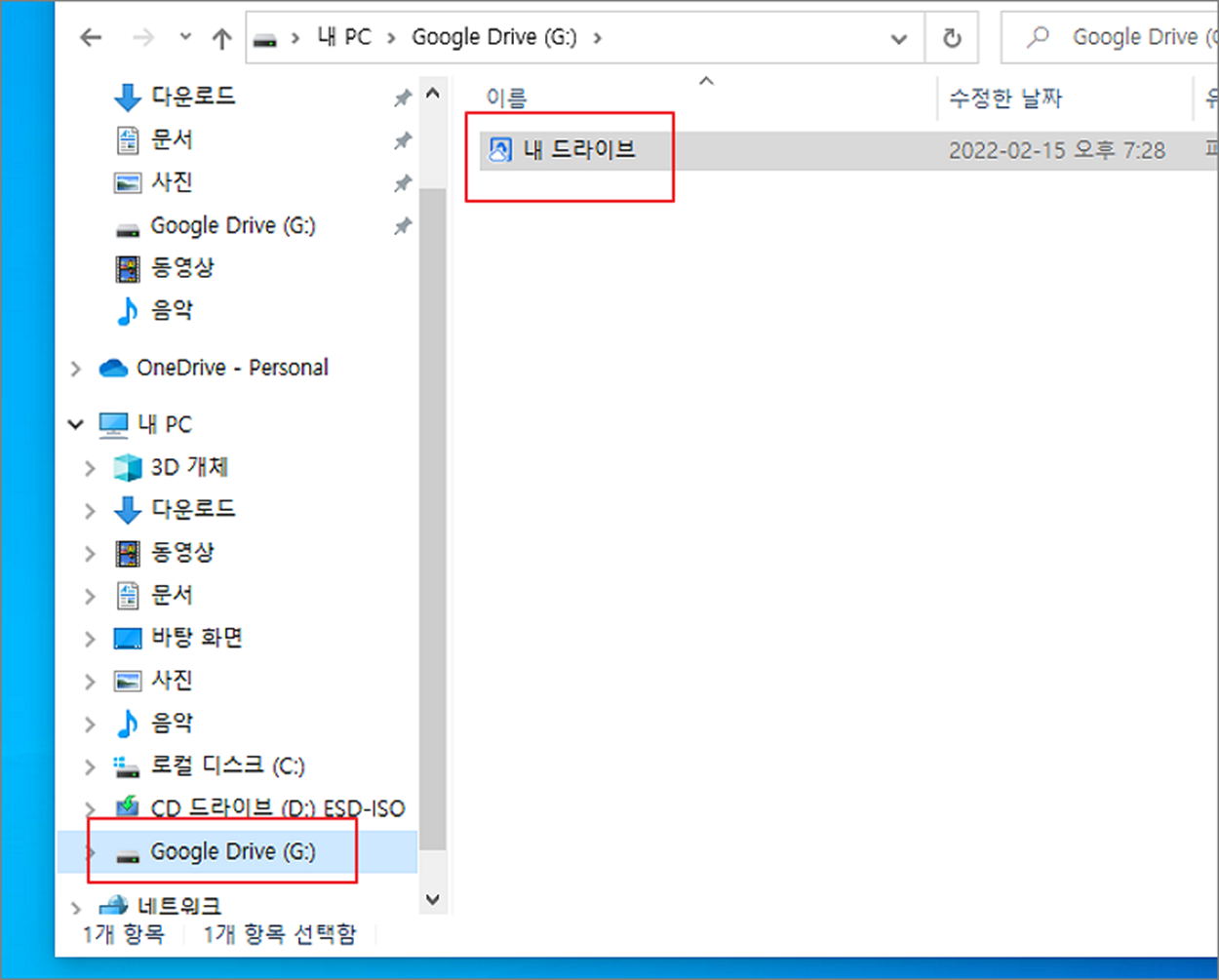 ▼ 탐색기를 띄워서 구글 드라이브 내 PC 에 추가되어 있는지 확인합니다. Google Drive > 내 드라이브 폴더로 들어가서 파일을 올려 보겠습니다.