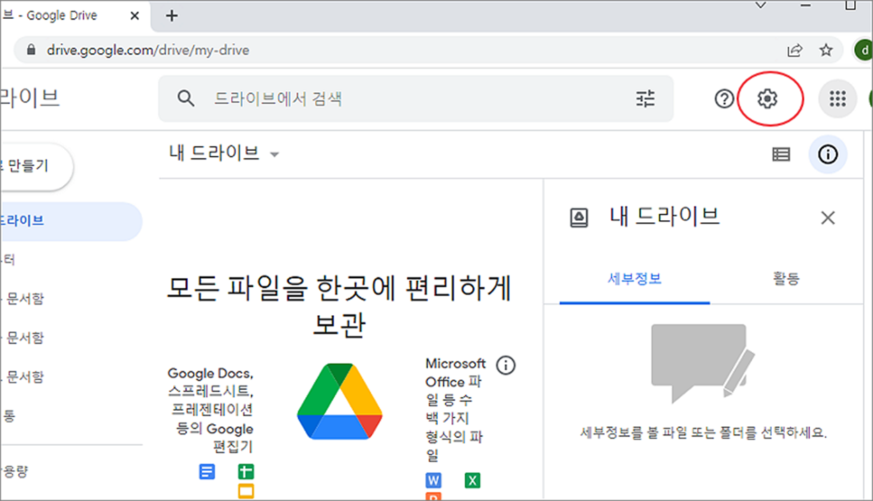 ▼ 다음은 구글 계정으로 로그인한 경우 드라이브 설치 파일을 다운받는 방법입니다. 구글 드라이브 관리 페이지에서 오른쪽 상단 설정 버튼을 클릭합니다.