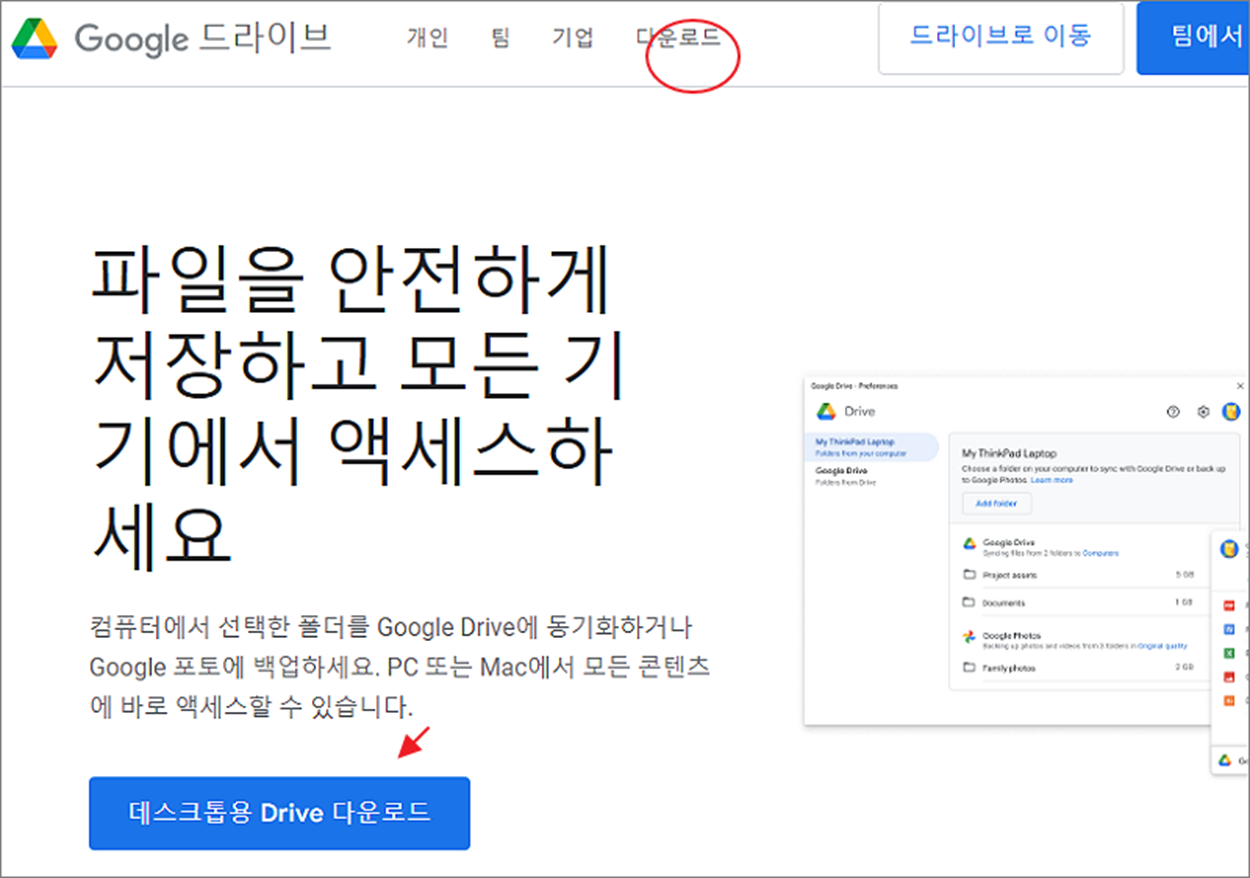 ▼ 구글 드라이브 관리 페이지로 이동해서 상단 다운로드 > 데스크톱용 Drive 다운로드 버튼을 클릭합니다.