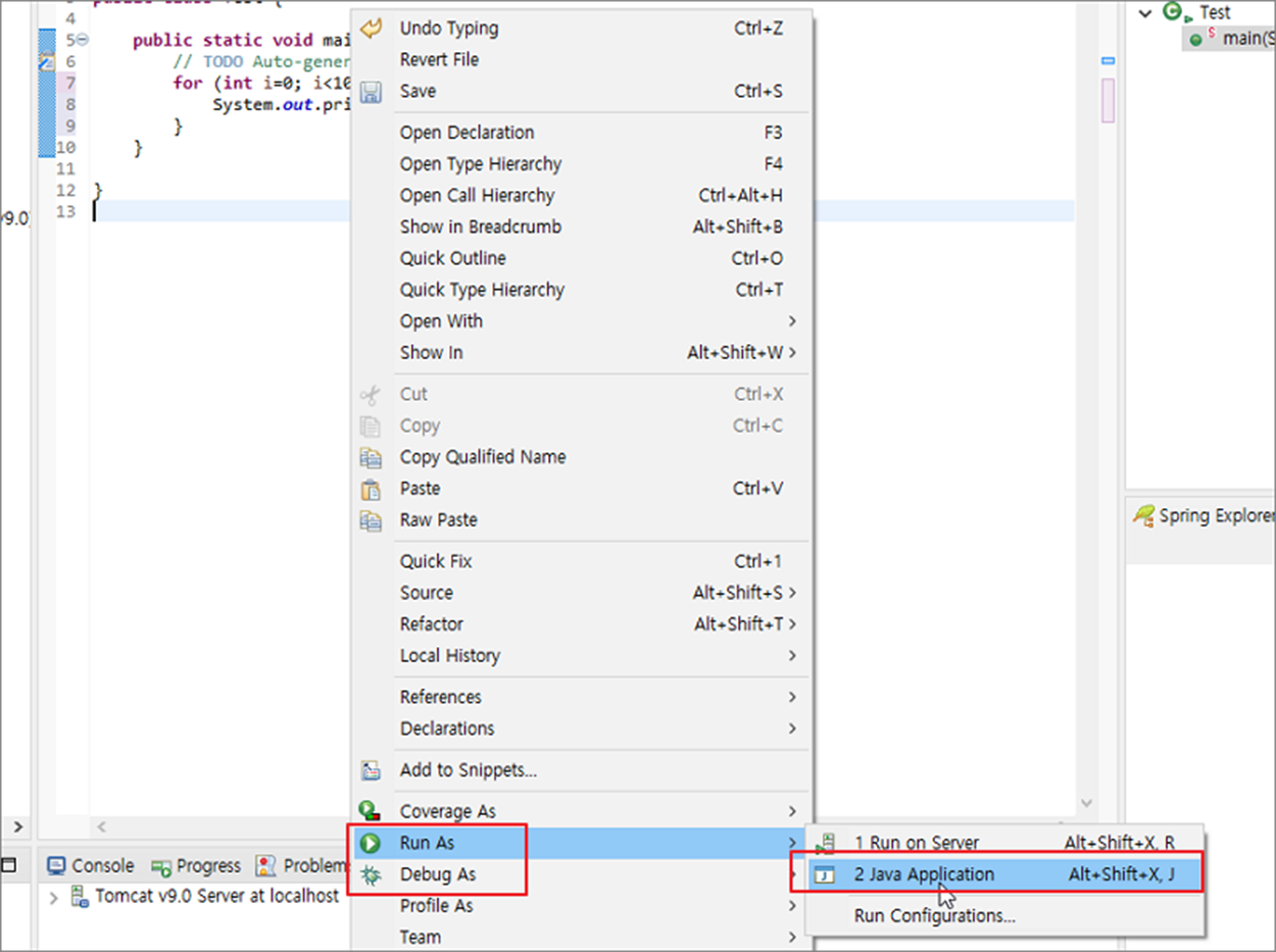 ▼ 이렇게 만든 소스를 제대로 동작하는지 실행해 보겠습니다. 방법은 두 가지인데, Debug As 와 Run As 입니다. Debug 는 브레이크 포인트를 걸어서 단계별로 진행할 수 있습니다. 오른쪽 마우스 > Run As/Debug As > Java Application 메뉴를 클릭해서 실행합니다.