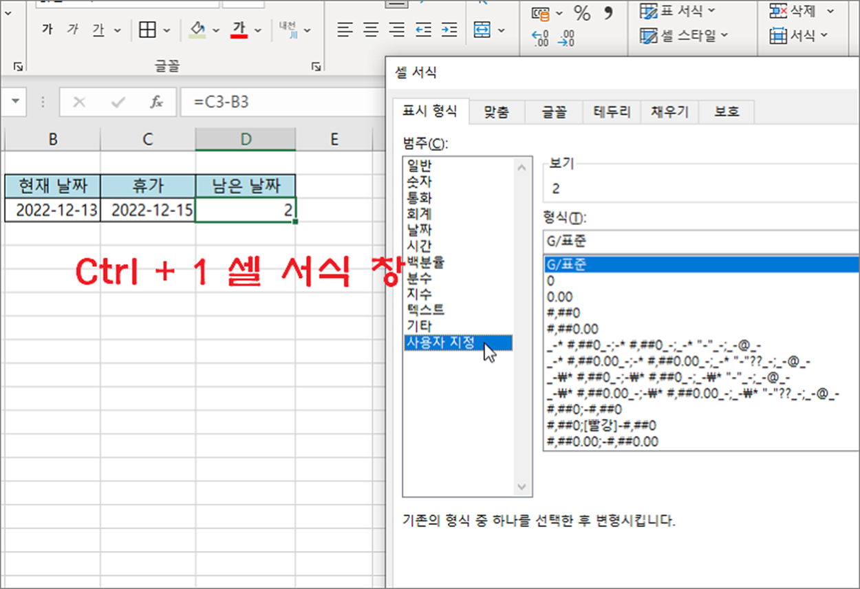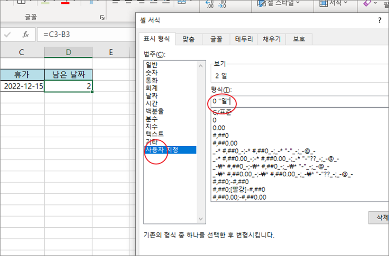 ▼ 다음 표시 형식 탭 > 범주에서 사용자 지정 메뉴를 선택합니다. 사용자 지정 > 형식으로 가서 숫자와 함께 “일” 이 항상 표시되도록 형식을 만듭니다. 0 은 셀 숫자를 뜻하는 기호입니다. 여기에 텍스트를 뜻하는 “” (쌍따움표) 와 함께 “일” 을 입력합니다.