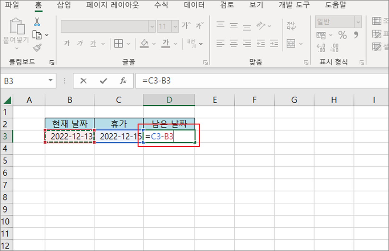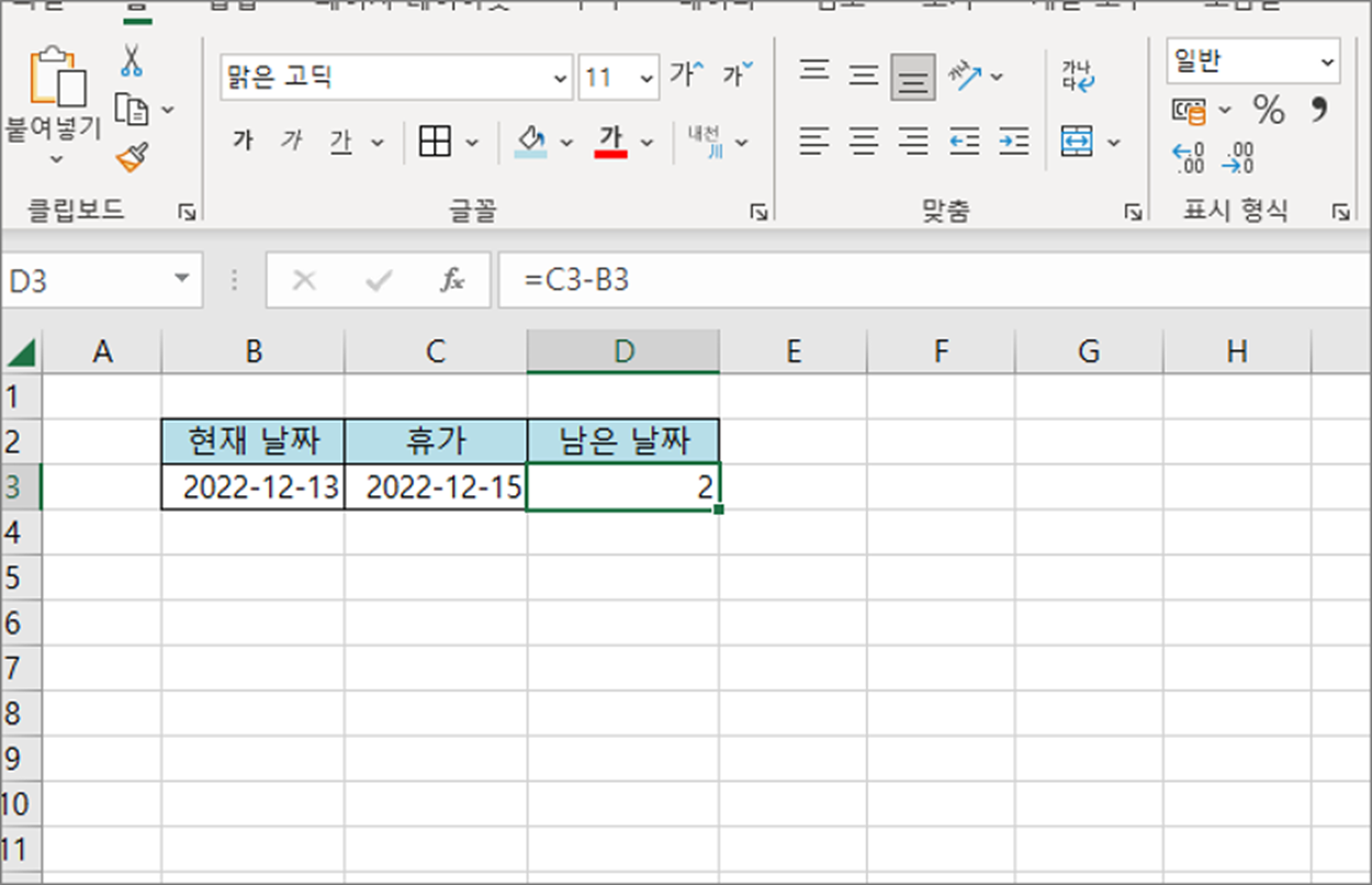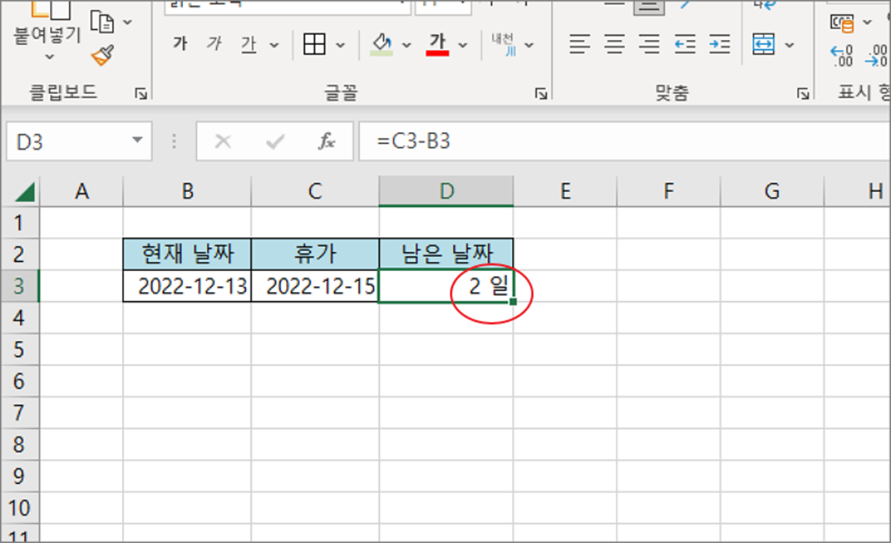 ▼ 결과는 다음과 같이 2 일이 나왔습니다. 이렇게 엑셀에서는 사칙연산 만으로 날짜 계산이 쉽게 빠르게 가능합니다.