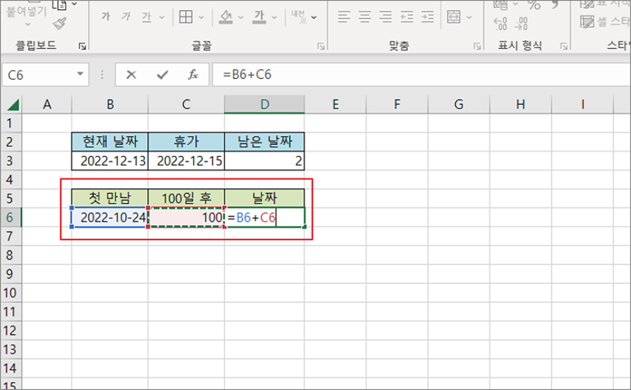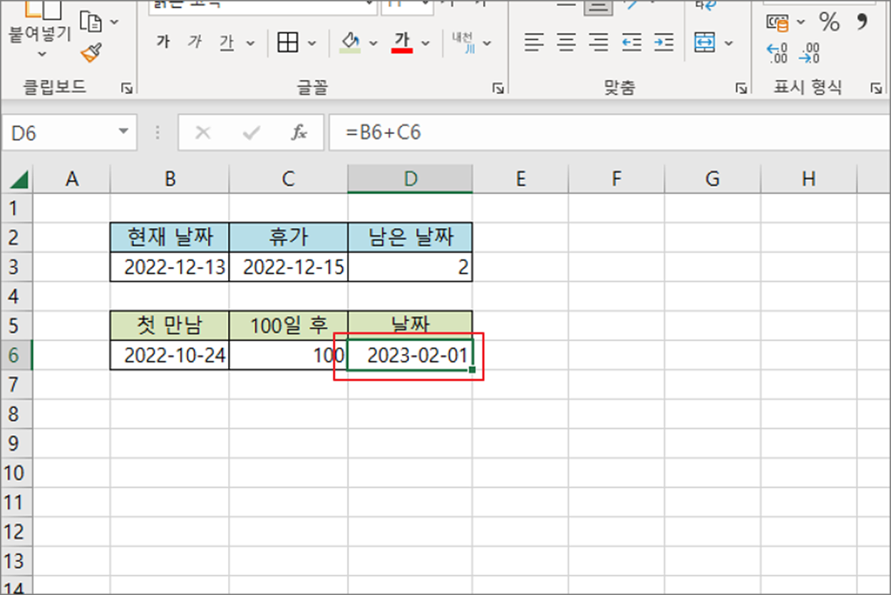 ▼ 다음은 날짜에다 숫자를 더해서 몇 월 몇일인지 구해 보겠습니다. 흔히 100일, 200일 등 특정 기간을 더한 기념일 계산할 때 유용합니다. 아이가 태어나서 100일이 되는 날, 여자친구와의 100일이 지난 날이 몇 월 몇일인지 찾고 싶을 때 사용해 보세요. 간단하게 일 수를 더하면 이후 날짜가 나옵니다.