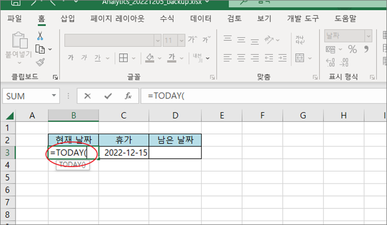 ▼ 먼저 엑셀 시트를 열 때마다 매번 현재 날짜를 입력할 필요 없이 자동으로 알아 올 수 있어야 합니다. 함수는 TODAY() 와 NOW() 두가지가 있습니다. 파라미터 없이 =TODAY() 라고 입력하고 Enter 를 누릅니다.