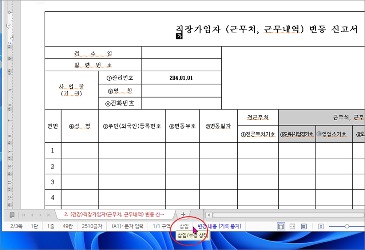 ▼ 다시 키보드를 입력했을 때 문서에 입력글이 제대로 들어가게 하려면 상태바 하단에 있는 “수정” 부분을 클릭해서 “삽입” 으로 변경해야 합니다. 혹은 키보드의 [Insert] 키를 누르시면 동일하게 적용할 수 있습니다.