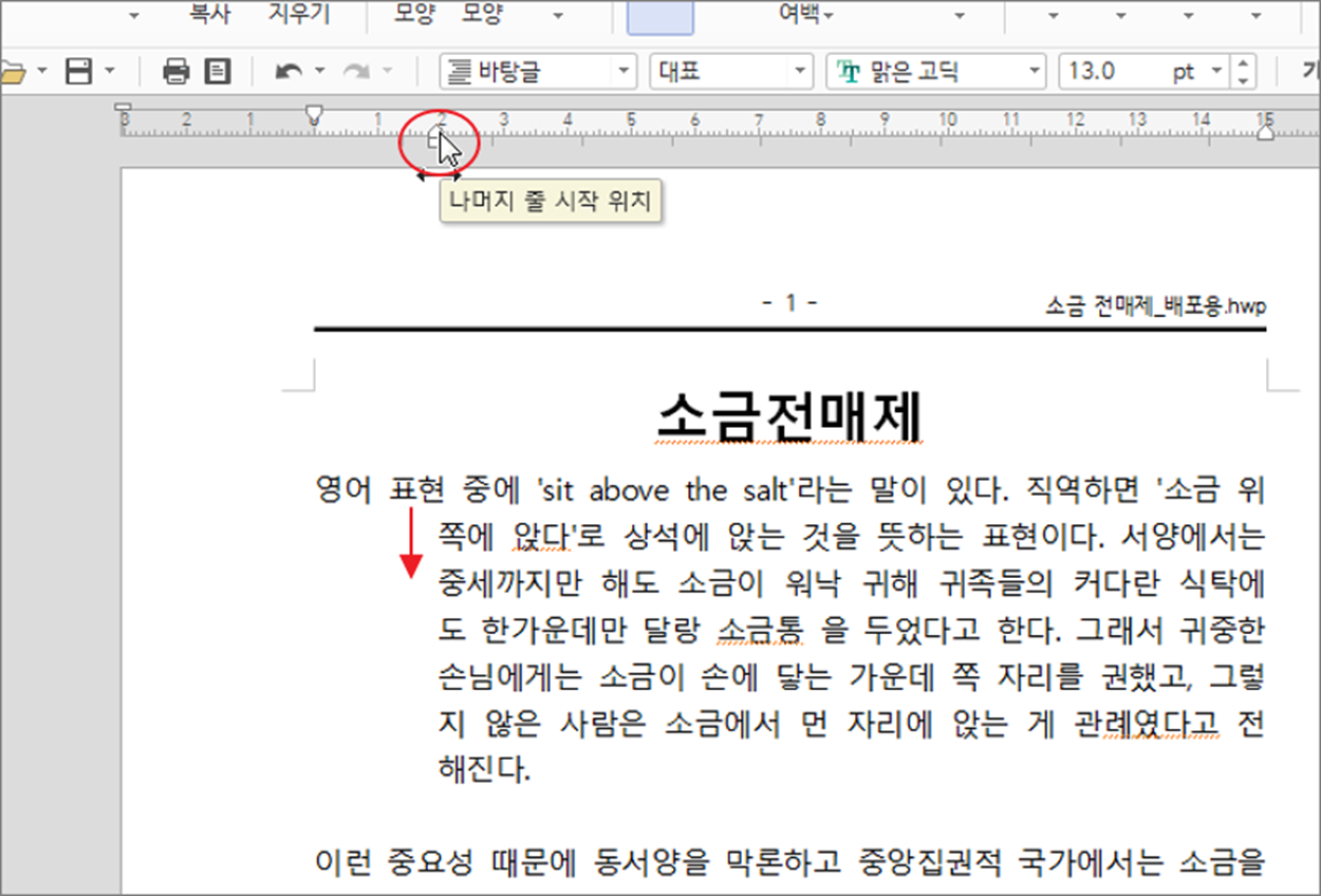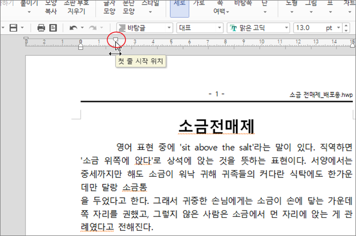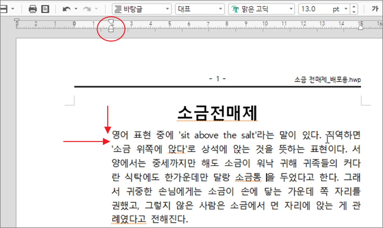 ▼ 다음은 상단 눈금자에 3개의 아이콘 중 상단에 있는 “들여쓰기” 입니다. 들여쓰기는 문단에서 첫 줄만 눈금자의 수치 만큼 오른쪽으로 이동합니다. 참고로 첫 줄 들여쓰기의 줄이고 늘이는 단축키는 Ctrl + F6 / Ctrl + F5 입니다.