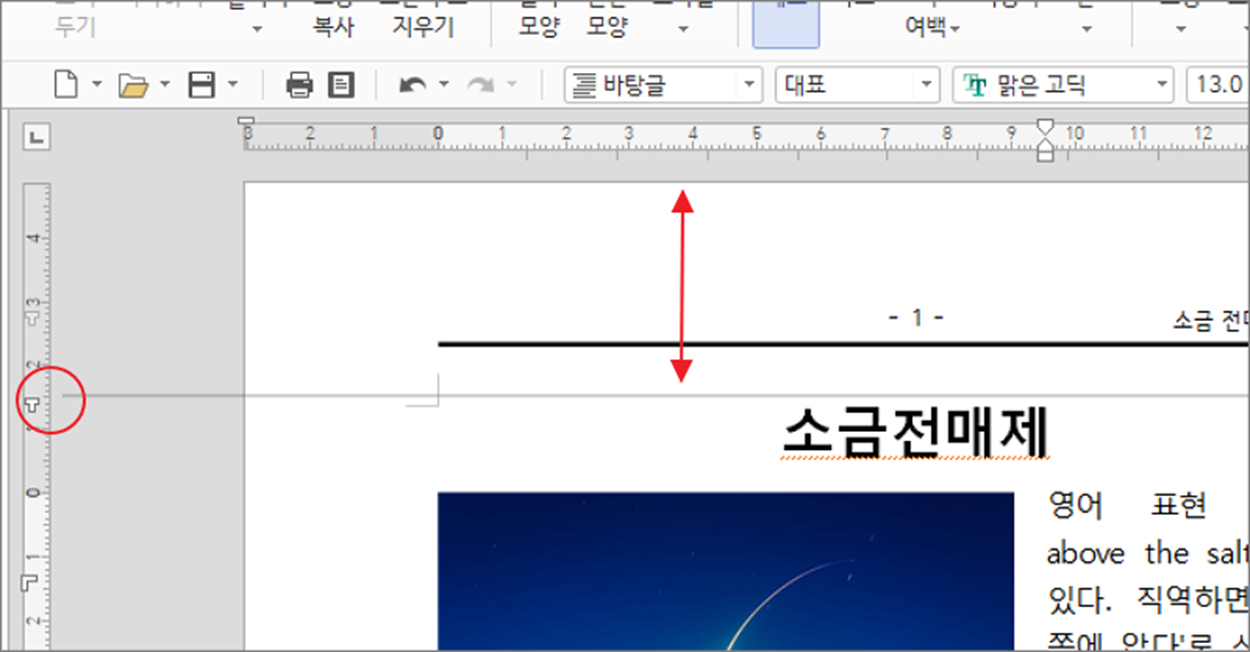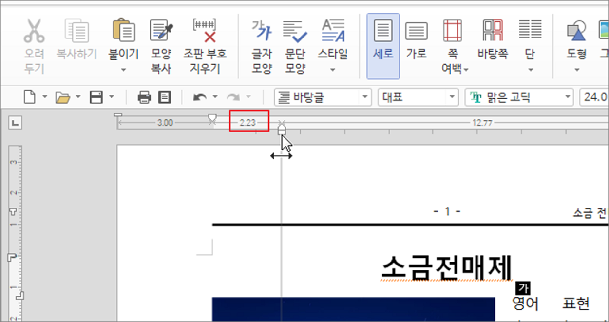 ▼ 첫 번째 “제본여백” 기능을 알아보겠습니다. “제본여백” 아이콘을 클릭하면 여백 경계를 나누는 라인이 나타납니다. 위 아래로 라인을 움직여 여백의 크기를 조절합니다. 상단에 있는 눈금자 끝에 “제본여백” 아이콘도 마찬가지입니다. 아이콘을 이용해서 왼쪽여백을 조절해 보세요.