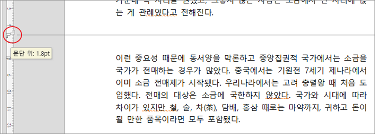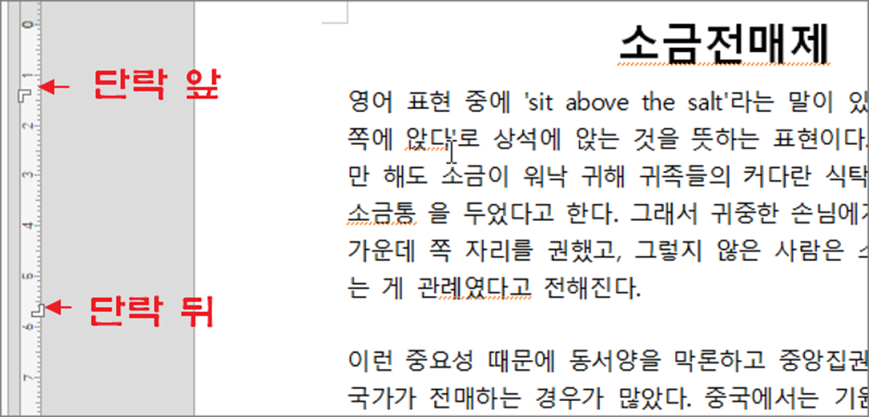 ▼ 왼쪽 사이드 눈금자에는 제본 여백 외에 단락 앞 뒤의 간격을 조절하는 아이콘이 있습니다.