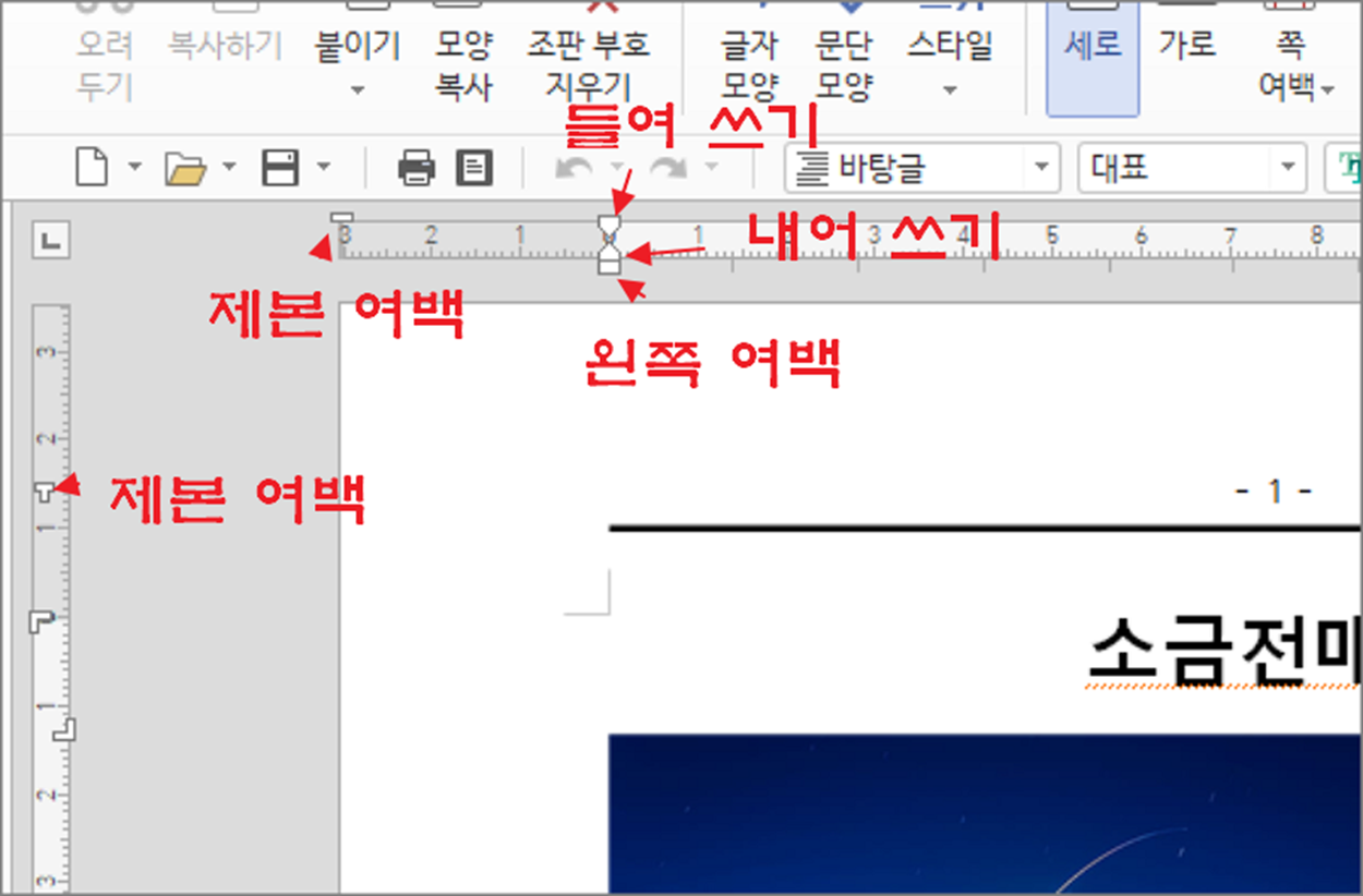 ▼ 눈금자에 있는 작은 도구들의 기능과 명칭을 알아보겠습니다. 아래 그림에서 왼쪽과 상단 눈금자 끝에는 “제본여백” 이 있습니다. 여백의 넓이를 조절합니다. 마우스로 아이콘을 끌면서 조절합니다. 상단 “제본여백” 바로 옆에는 3개의 아이콘이 합쳐진 형태를 볼 수 있습니다. 제일 상단에 있는 것이 “들여쓰기” 중간에 있는 아이콘이 “내어쓰기” 이며, 제일 밑에 있는 아이콘이 “왼쪽여백” 입니다.