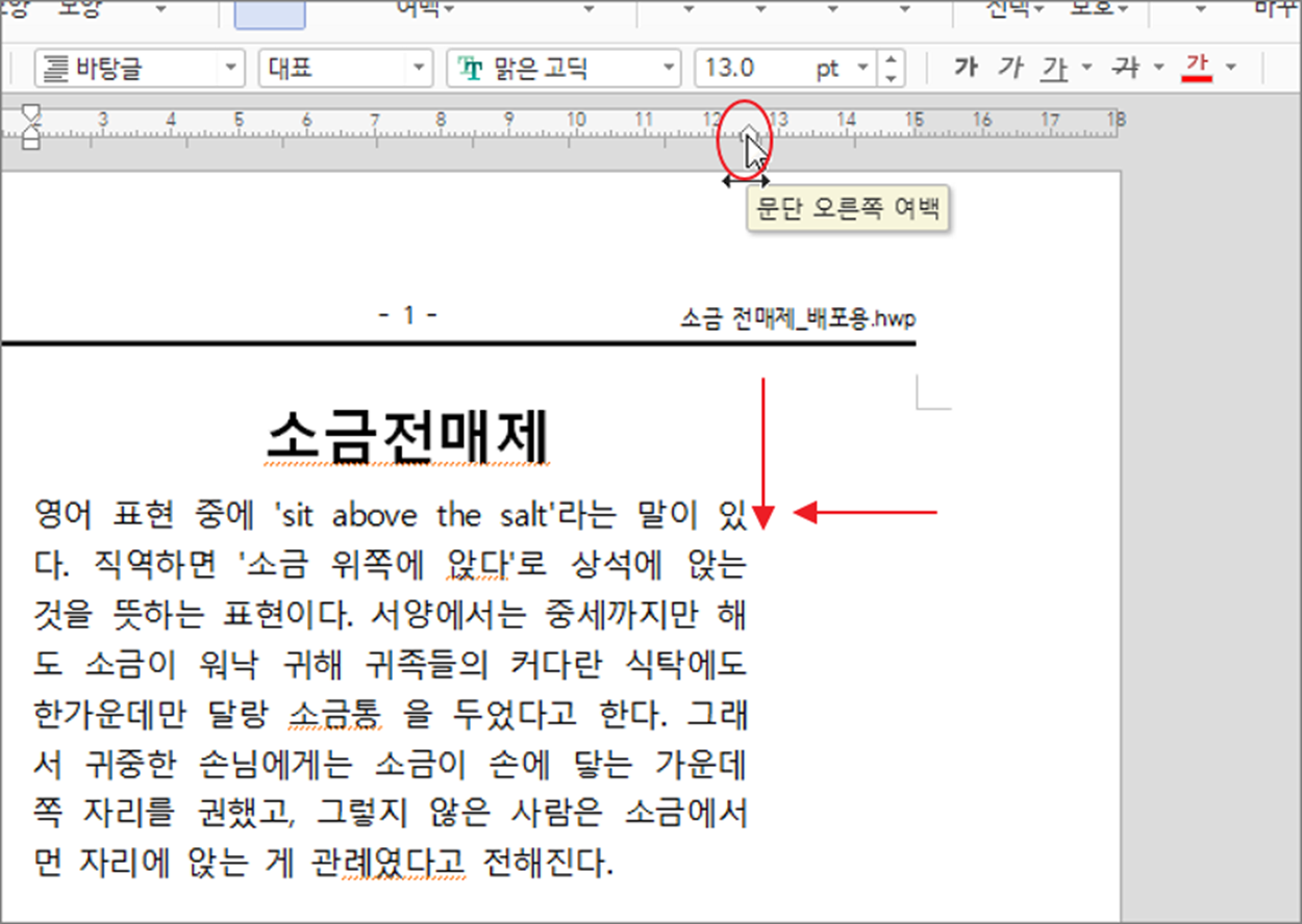 ▼ 그럼 단락별로 오른쪽 여백은 어떻게 조절할까요? 왼쪽 여백을 조절하는 아이콘이 있듯이 오른쪽에도 존재합니다. 글은 왼쪽부터 시작하므로 오른쪽에는 들여쓰기와 내어쓰기는 없습니다. 그래서 전체 여백을 조절하는 아이콘만 제공합니다. 오른쪽 여백 줄이고 늘이기 단축키는 Ctrl + Alt + F7 / Ctrl + Alt + F8 입니다.