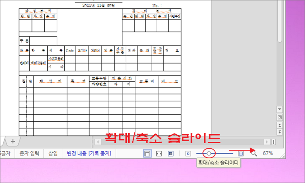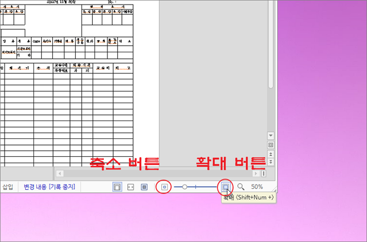 ▼ 사용 방법은 간단합니다. 먼저 축소 버튼을 눌러 보세요. 한번 클릭할 때마다 5% 씩 축소합니다. 기본 100% 에서 얼마나 축소했는지는 편집 화면 하단 상태바에서 확인이 가능합니다.
