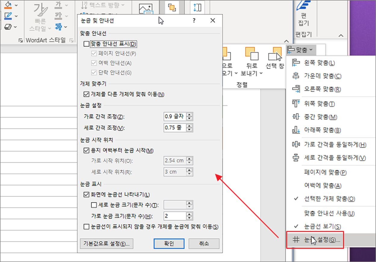 ▼ 화면에 나타난 눈금의 간격과 여백은 사용자가 원하는 대로 변경이 가능합니다. 눈금 설정 메뉴를 눌러 설정창을 띄웁니다.