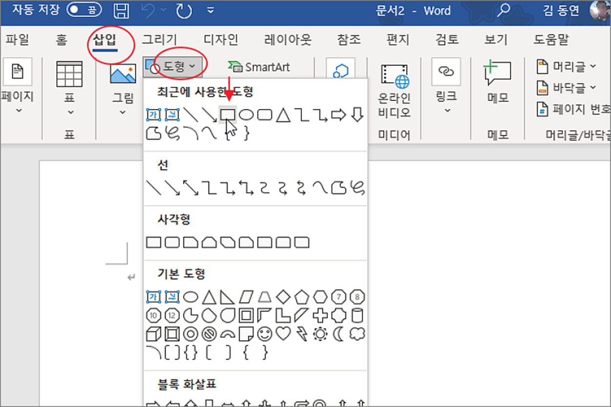 ▼ 저 워드에 샘플로 사용할 도형을 추가해 보겠습니다. 삽입 탭 > 도형 리본 메뉴를 눌러 도형 목록이 있는 창을 띄웁니다. 원하는 도형을 클릭하고 마우스를 워드 페이지로 가져갑니다.