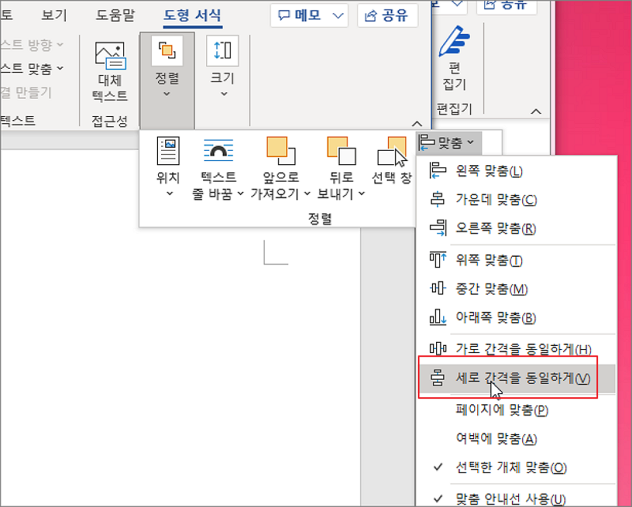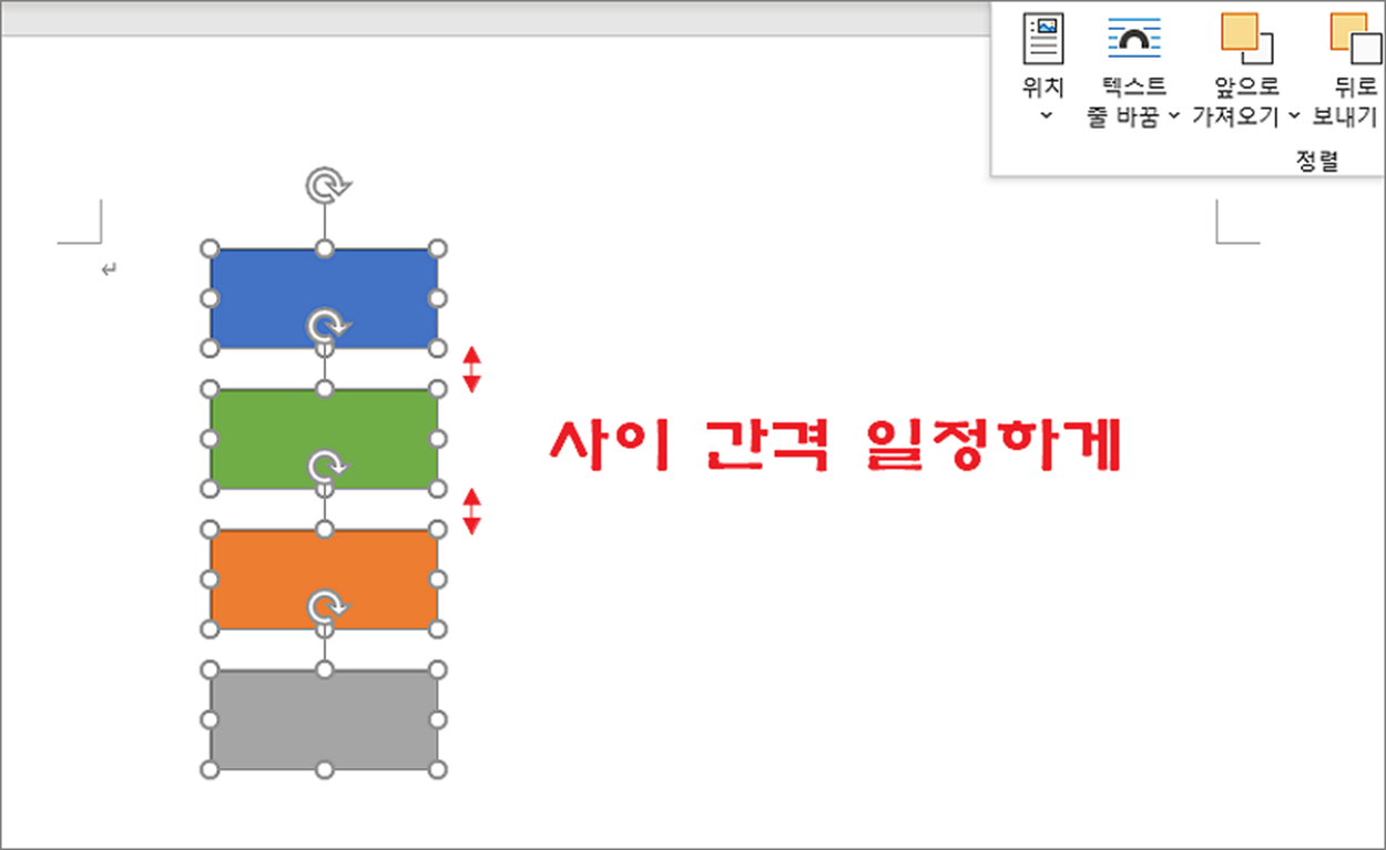 워드에서 텍스트와 달리 도형은 개체입니다. 텍스트처럼 줄에 따라 정렬할 수 없고 별도의 기능이 필요합니다. 도형 같은 여러 개체들을 어떻게 정렬하고 간격을 유지하는지 알아보겠습니다.