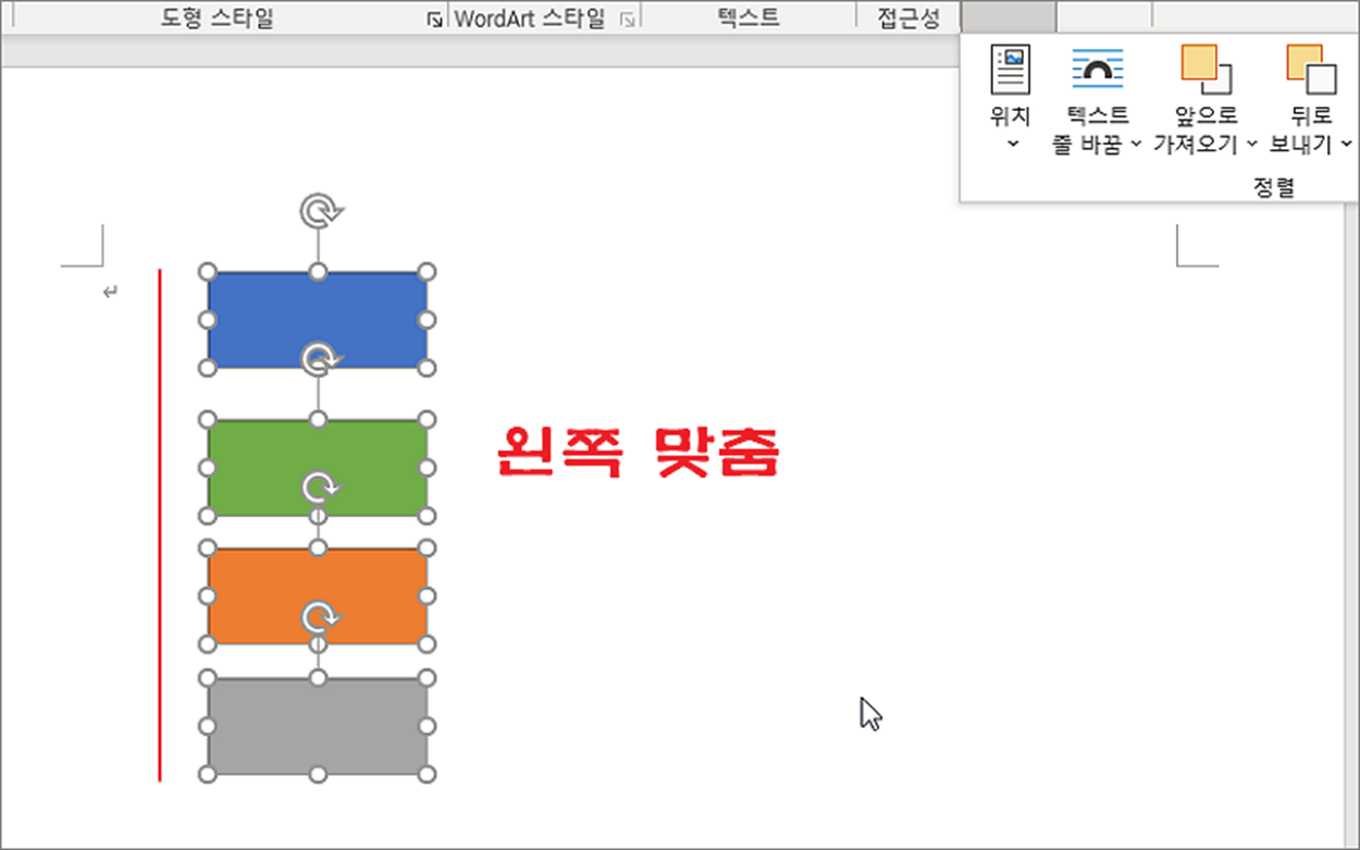 ▼ 맞춤 하위에는 도형 정렬에 필요한 다양한 메뉴들이 있습니다. 세로로 나열되어 있는 도형을 왼쪽/오른쪽으로 맞춥니다.
