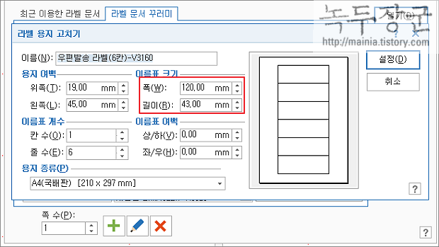 ▼ 라벨 용지 고치기 창에서 쪽과 길이 값을 실제 라벨지의 규격과 동일한지 확인합니다.