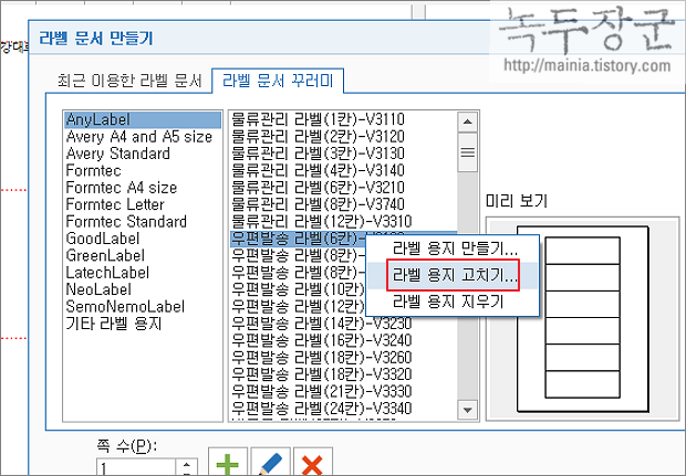 ▼ 실제 라벨지에는 규격이 나와 있습니다. 프린트하는 용지에 맞게 규격을 맞춰야 합니다. 선택한 라벨지의 규격이 맞는지 확인해 보겠습니다. 라벨을 선택하고 오른쪽 마우스 > 라벨 용지 고치기 메뉴를 선택합니다.