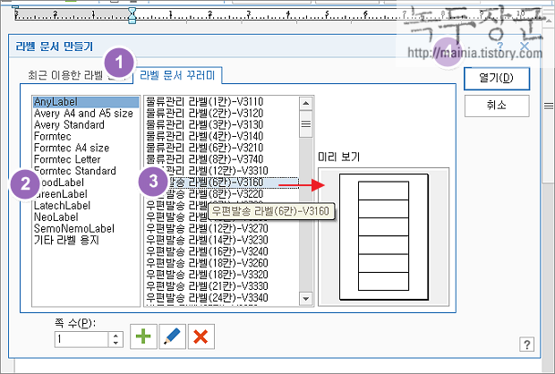 ▼ 한글에서 지원하는 라벨 중 하나를 선택하고 싶다면 라벨 문서 꾸미기 탭으로 이동합니다. 번호 순서대로 원하는 라벨지를 찾아 선택하고 열기 버튼을 클릭합니다. 미리보기에서 라벨지의 형태를 확인할 수 있습니다.
