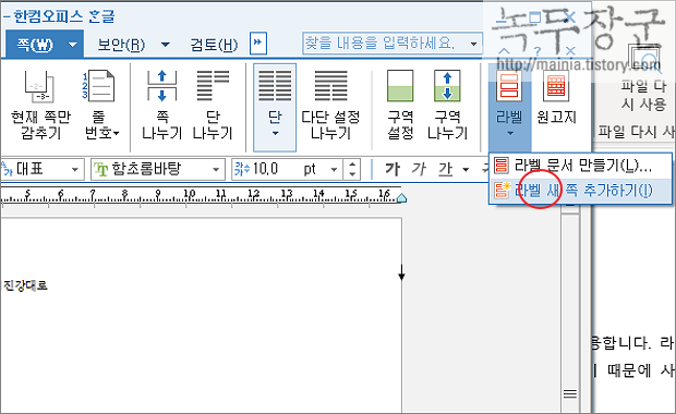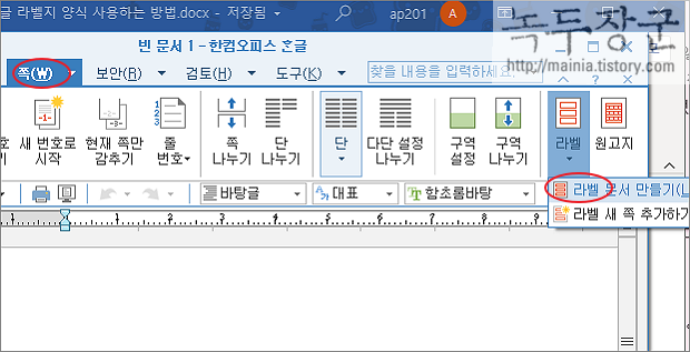 ▼ 라벨지를 만들기 위해 메뉴에서 쪽 탭 > 라벨 로 이동합니다. 라벨 리본 메뉴에는 두가지 하위 메뉴가 있습니다. 새 라벨을 추가하고 싶다면 라벨 문서 만들기 메뉴를 선택합니다.