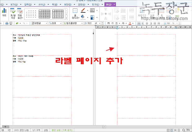 ▼ 라벨 리본 메뉴에는 "라벨 새 쪽 추가하기" 가 있습니다. 이것은 첫 번째 페이지에 만든 동일한 라벨 페이지를 새로 추가하는 기능입니다. 아래 그림과 같이 버튼을 클릭하면 바로 하단에 동일한 페이지가 생깁니다. 이렇게 동일한 라벨지는 [라벨문서 만들기] 대화상자로 가서 만들 필요가 없겠죠.