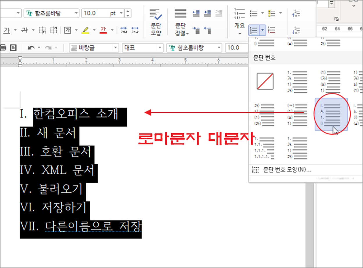 ▼ 전체 문단을 선택하고 문단 번호에서 로마문자 대문자를 선택해 보세요. 한번에 순서대로 로마숫자가 추가가 됩니다.