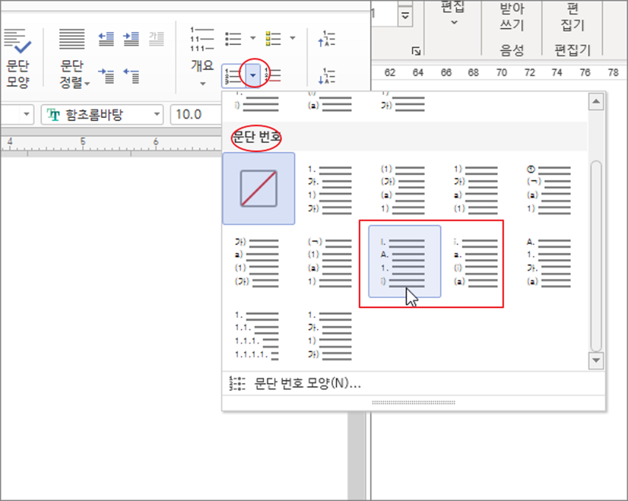 ▼ 상단 서식 탭 > 문단 번호가 있은 리본 메뉴로 이동합니다.